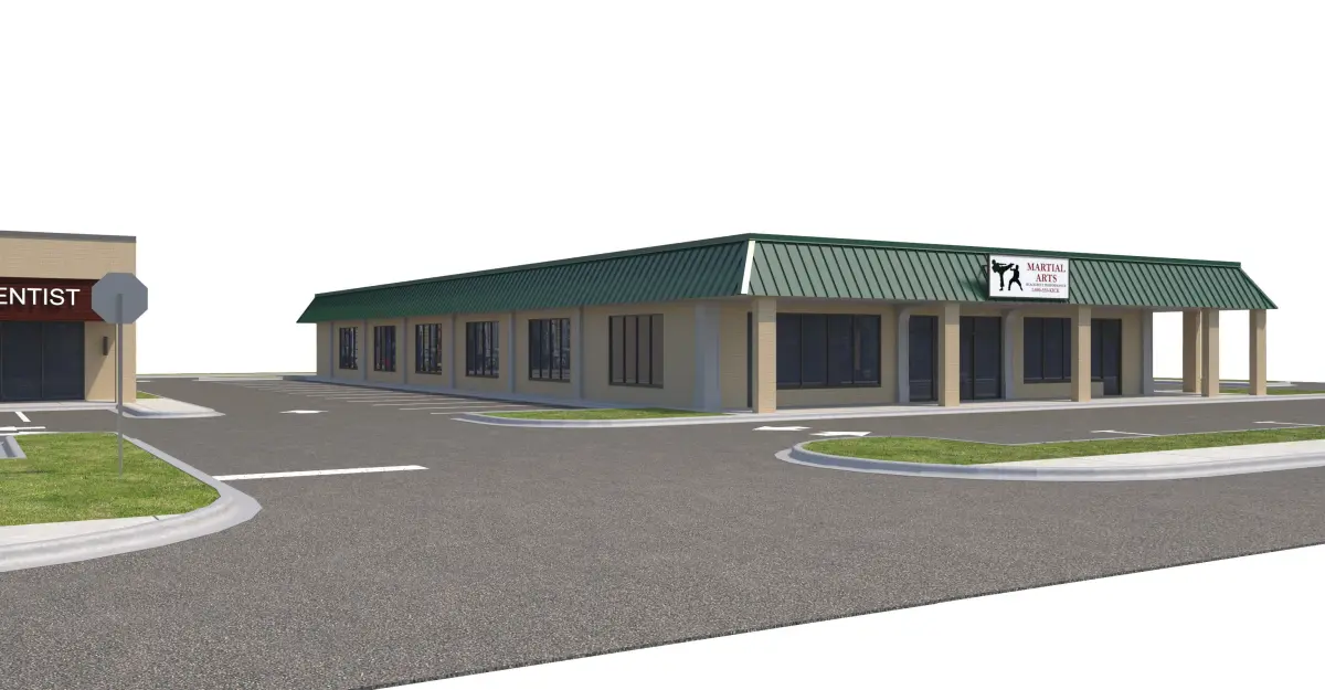 Yellow Brick, Eifs Walls and Piers, Wood infill accent Panels. Buildings have a overhang roof over the sidewalk for covered walkway. Included with model is front sidewalk, parking lot, side sidewalk for street connection, rear sidewalk and doors, everything shown in rendering