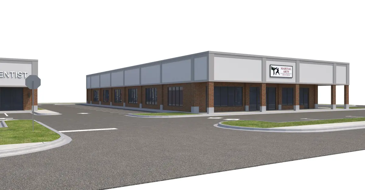Red Mixed Brick, Cast Stone, Eifs Upper Walls with Different Colored Trim Pieces, Buildings have a overhang roof over the sidewalk for covered walkway. Included with model is front sidewalk, parking lot, side sidewalk for street connection, rear sidewalk and doors, everything shown in rendering