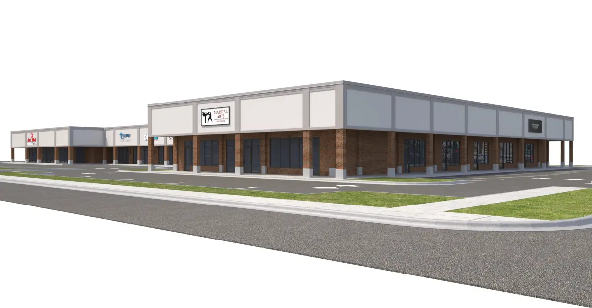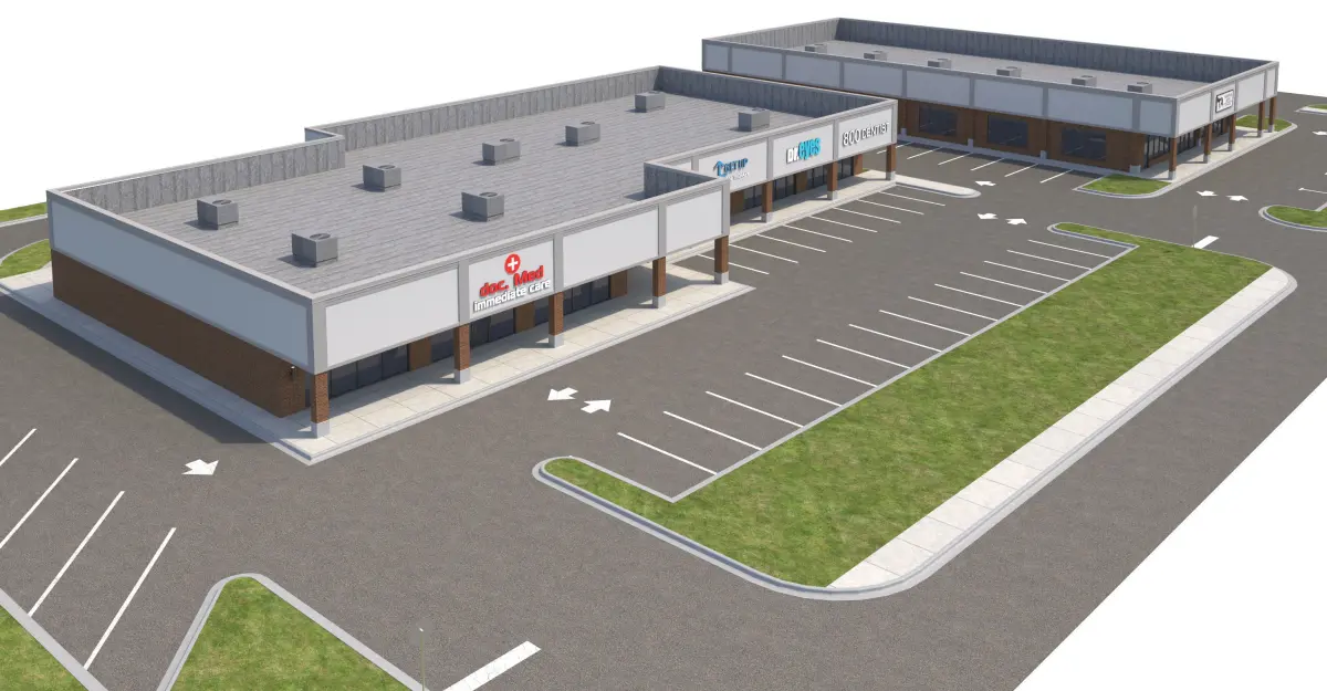 -3D model of a strip mall/outdoor Mall with tenants as shown in renderings-Interior Included, Interior Includes: Acoustical Ceiling tile and Light Fixtures, as well as interior walls and demising wall between tenants.