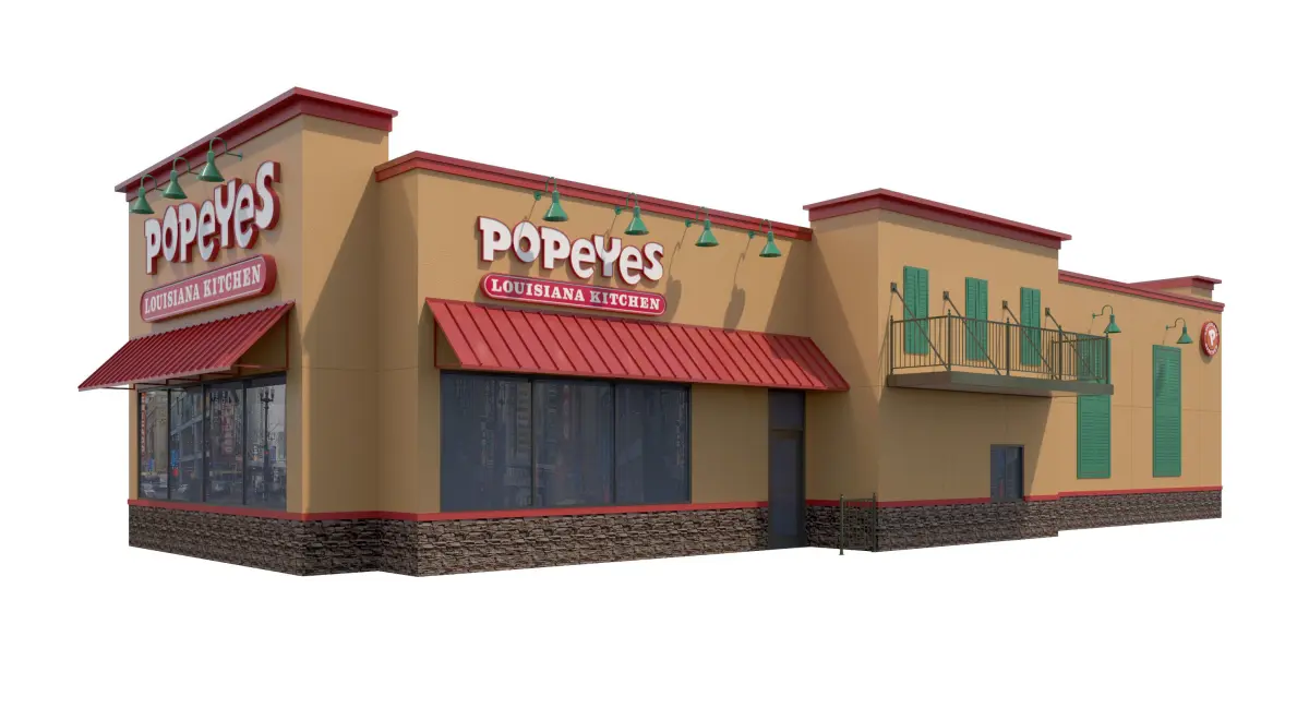-Retail-026 PopeyesHigh Detail 3d Exterior Model of a Restaurant: Popeyes, Louisiana KitchenModeled to Scale and Dimensions: (Imperial)+/- 83' x 32' x 19-0'' at main parapet+/- 2,700 Square Foot BuildingPolygons: 101,912, Vertices: 81,300Most polygons and vertices are in signage, Each Sign: Polygons: 10,777, Vertices: 21,370Model without signs: Polygons: 27,841, Vertices: 33,801-Building Materials are: Eifs, Metal, Stone-Model includes:*Exterior Enclosure*Awnings*Signage*Roof top mechanical units on curbs*Textures*Doors and windows*Light Fixture and IES light for light fixtures, IES light levels may have to be adjusted based on scene*Interior Slab*Some interior walls*Canopy with railings*Shutters