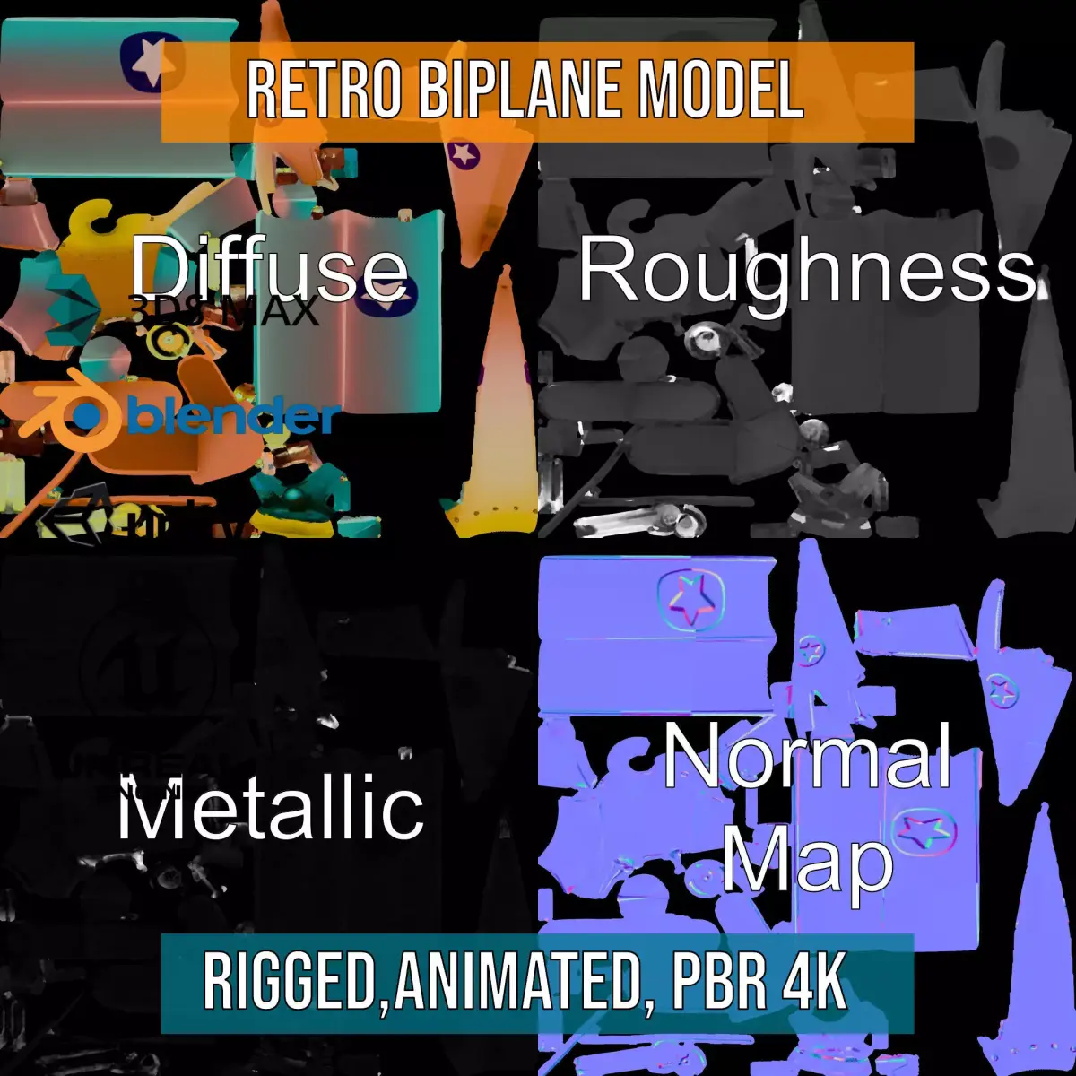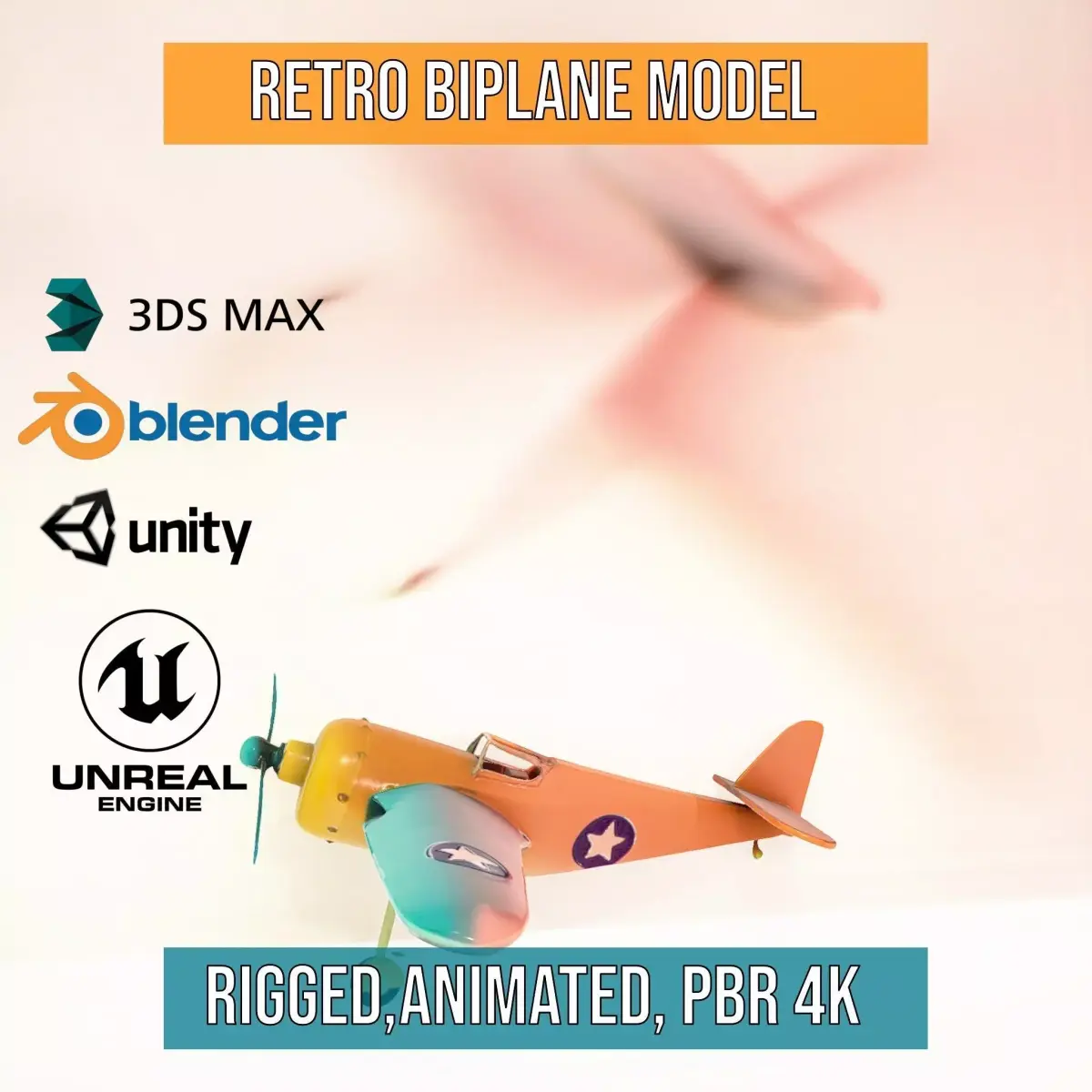 This vibrant retro biplane model is perfect for aviation enthusiasts and historical simulations. Each model has 3 levels of detail: low-poly (1000 triangles for mobile), middle-poly (10,000 triangles for environment), and high-poly (100,000 triangles), which allows for the use of this model in production rendering (such as 3ds Max, Maya, Cinema4D, Blender, V-Ray/Corona/Cycles and all others), game engines (Unity and Unreal compatible), and interactive presentations, providing a choice of detail based on the LOD System principle. This model is ideal for use in historical games, aviation exhibits, and animation projects. The model's textures are PBR, Diffuse, NormalMap, and reflection/roughness/metallic, which are suitable for any modern rendering engine. All models accurately unwrapped and have no overlapping UV. Textures are 4096*4096 in size. If you enjoyed the model, please like and leave a comment.