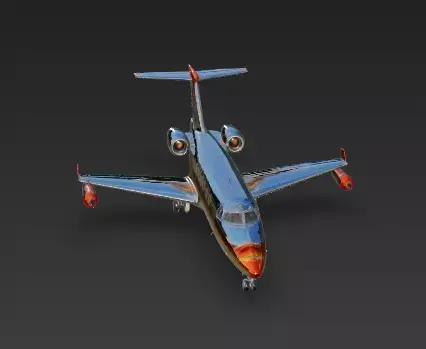 Sunset Striping To break up the silver, the jet features a classic 70s stripe livery. Thick bands of brown, orange, and yellow run from the nose, along the fuselage, and up the tail. This sunset color palette is instantly nostalgic and grounds the asset in a specific time period.