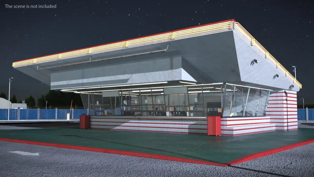Retro Fast Food Restaurant is a high quality, photo real 3d model that will enhance detail and realism to any of your rendering projects. The model has a fully textured, detailed design that allows for close-up renders, and was originally modeled in 3ds Max 2020 and rendered with V-Ray. Renders have no postprocessing!