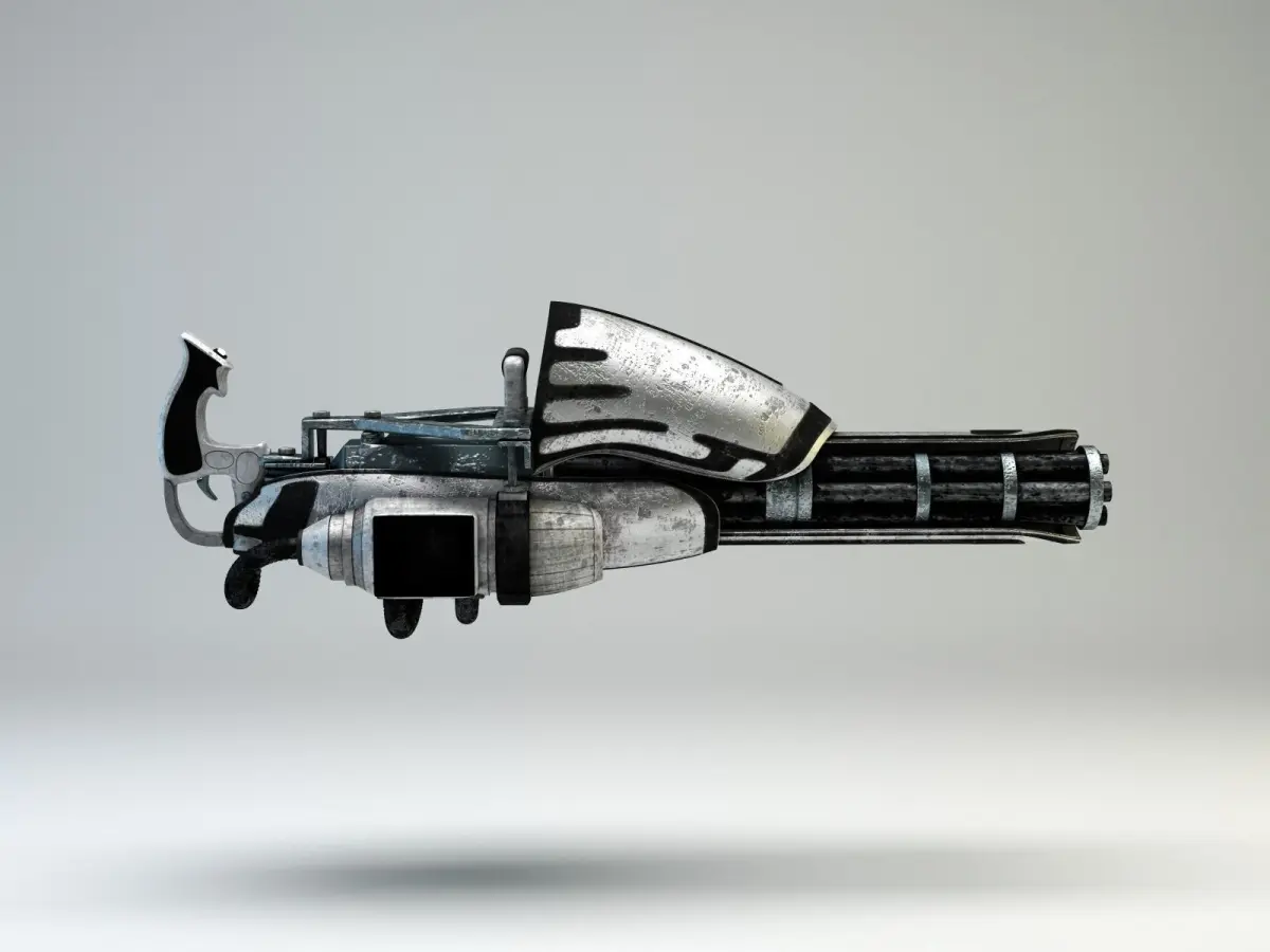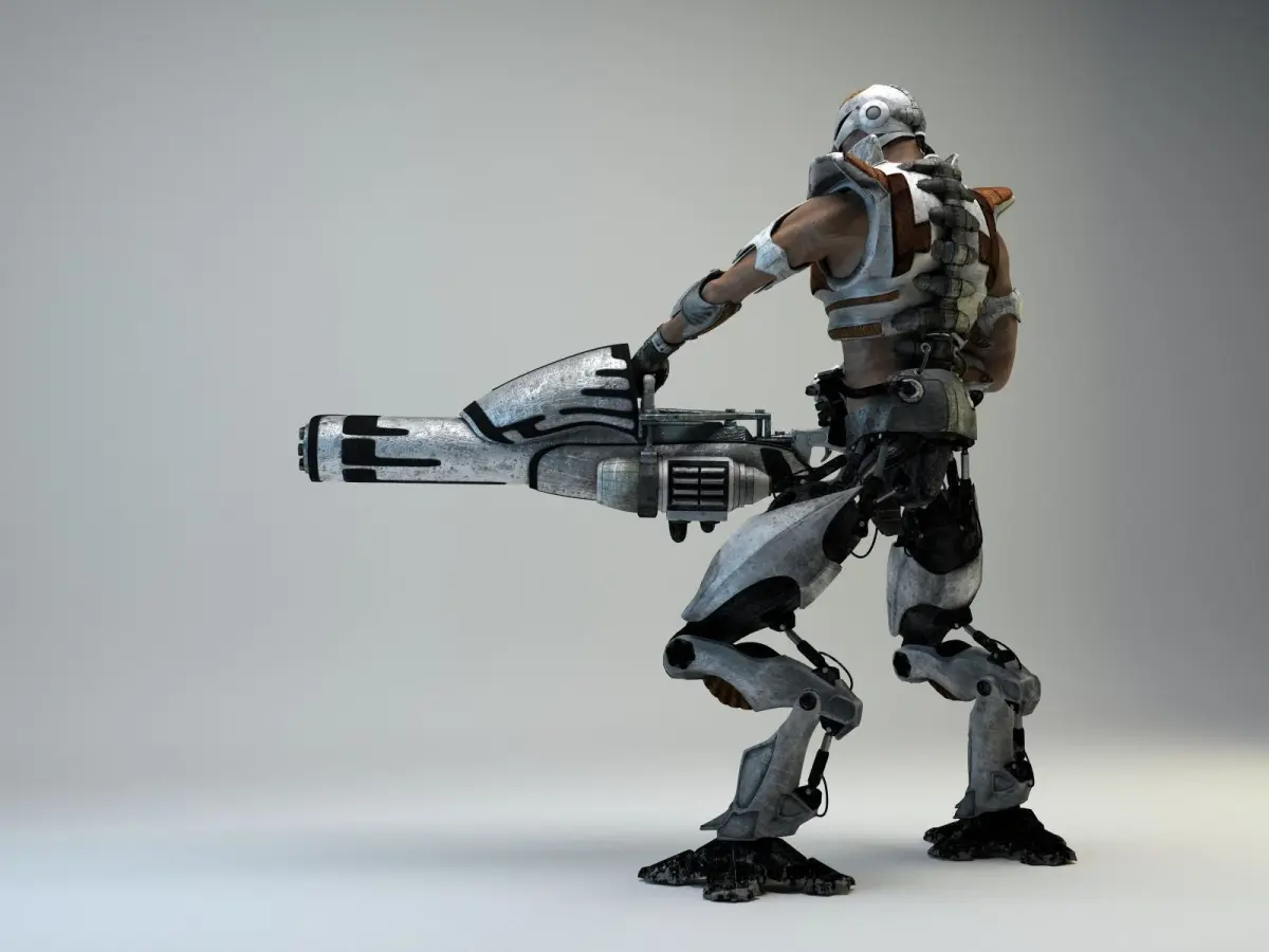 Medium Definition, mid-poly retro-futuristic Mechborg (Mech Cyborg) with a minigun. The model has basic rig applied. Multiple 2K textures included in the pack (diffuse, specular and displace). Studio setup with lighting included.