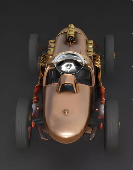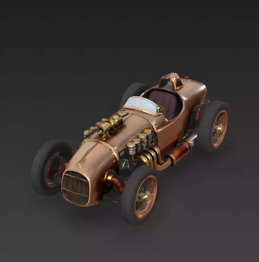 The Overall Concept This asset is a high-speed racing car from an alternate Steampunk past. It combines the sleek, cigar-shaped body of a 1930s Grand Prix racer with raw industrial materials like copper and brass.