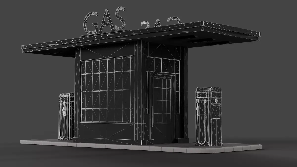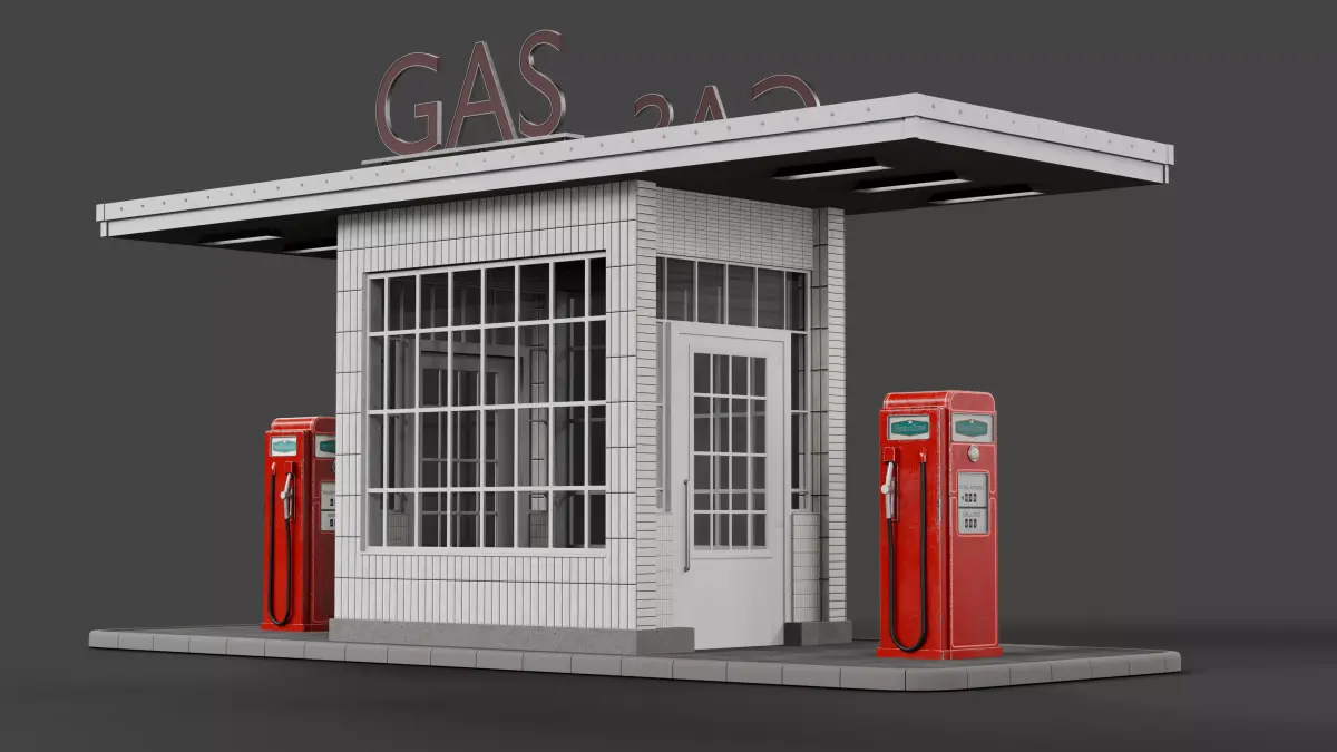 Retro gas station Made in BlenderHigh quality polygonal model, correctly scaled in the real world and centered at 0, 0, 0.