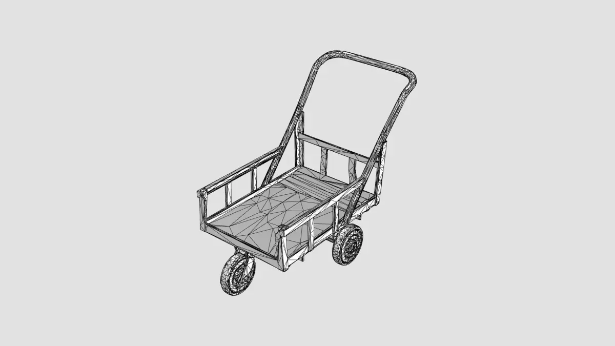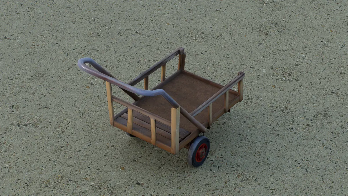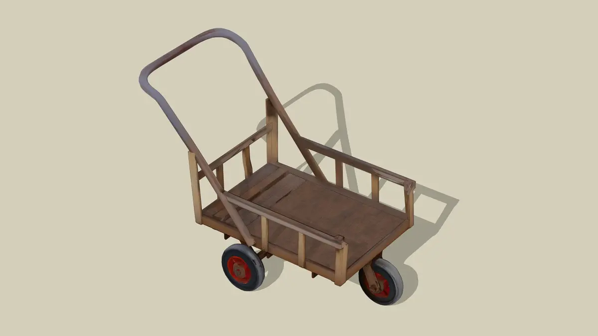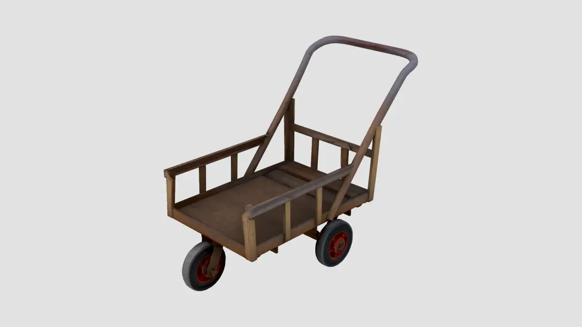This 3D low-poly model represents an old, weathered handcart, designed with a minimal polygon count for efficient use in real-time applications like games or historical simulations. The model features a wooden platform, a curved metal handle, and red-rimmed wheels, showcasing a rustic, aged appearance. Its lightweight design and detailed texture make it suitable for industrial scenes, vintage settings, or educational projects.
