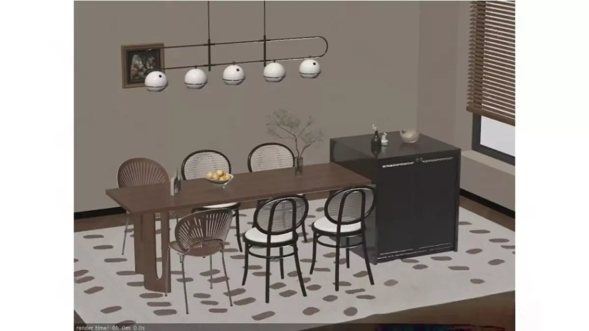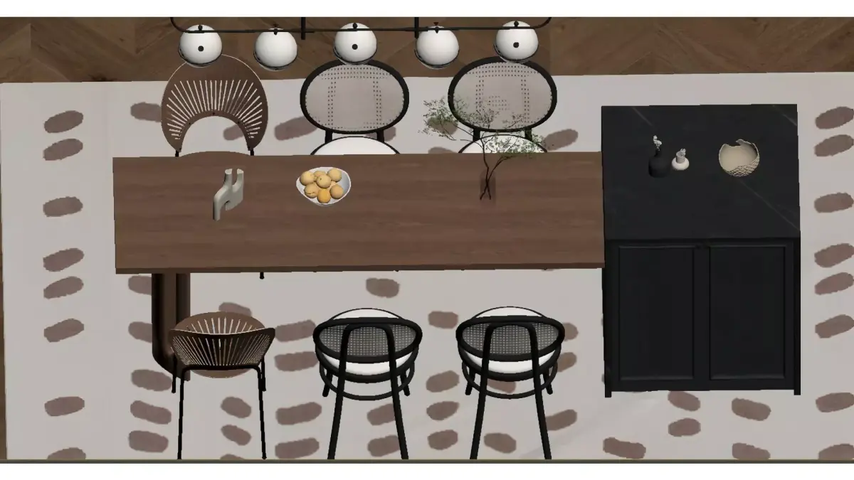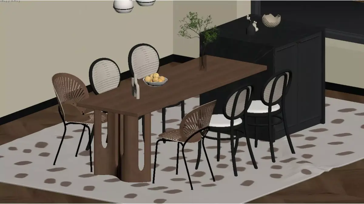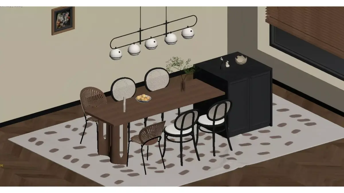 This is a set of cream-toned Chinese-style vintage restaurant design, with black walnut dining tables as the core, paired with dining chairs made of rattan weaving and solid wood, creating a warm and retro texture. The integrated layout of the island and the dining table not only expands the operating space but also takes into account the storage function (with dark-colored sideboards), meeting the practical needs of small apartments.Complemented by retro chandeliers with simple lines and polka-dot carpets, the overall color palette is soft (cream walls + wood tones + dark gray). It combines retro charm with the sense of relaxation in modern life, making it a mid-century modern light luxury home scene that balances aesthetic appeal and functionality.