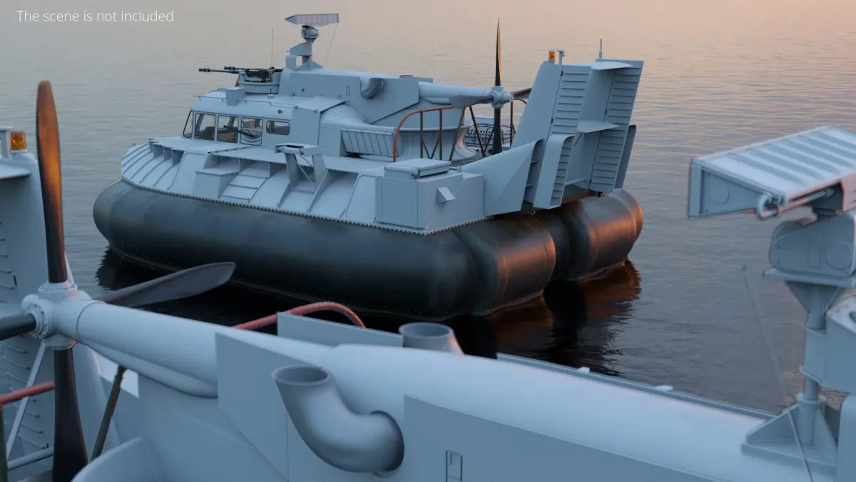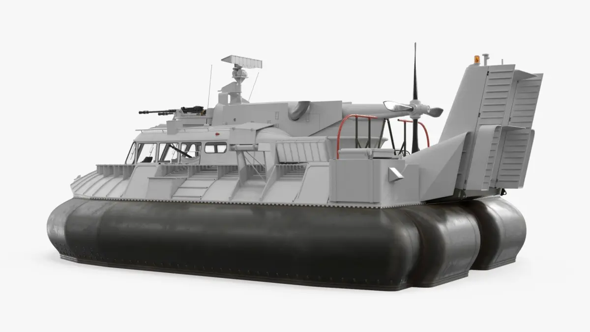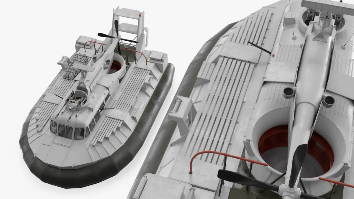 This hovercraft model showcases a detailed structure equipped with a reinforced hull, maneuverable propellers, and a powerful lift system for smooth transitions between land and water. It includes defensive weaponry, such as mounted guns, and a sophisticated control deck for mission-critical command operations.