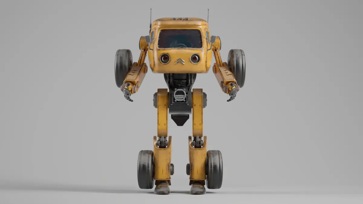 The model features a retro-inspired minibus head, detailed mechanical limbs, and expressive hands, perfect for storytelling and expressive animation. It comes with high-quality PBR textures and is fully UV unwrapped.