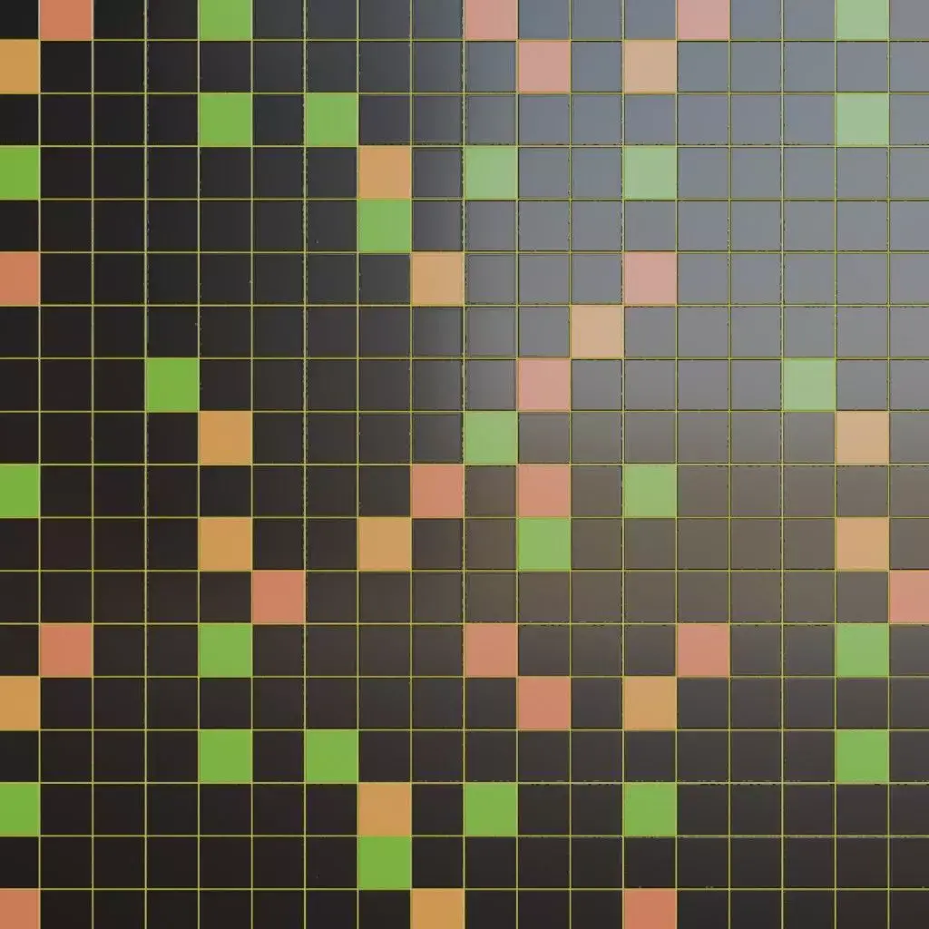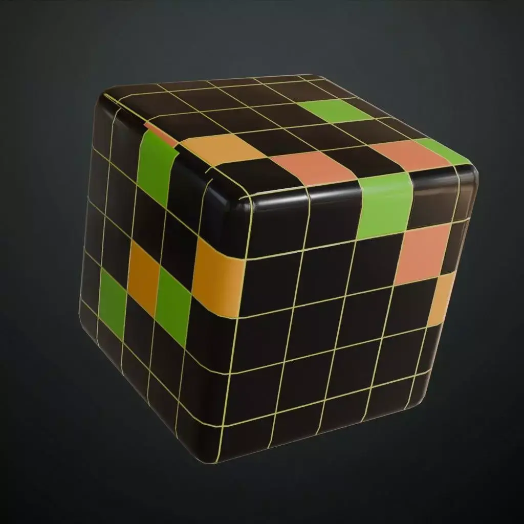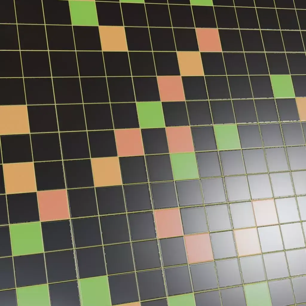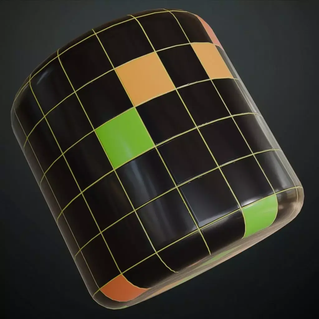This is a PBR Texture Pack of Retro Modern Glossy Square Tiles. The design features a playful checkerboard layout of high-gloss black tiles accented with vibrant green, orange, and yellow squares. The thin, clean grout lines and sharp reflections make this material perfect for retro-themed diners, mid-century modern kitchens, or stylized urban architectural visualizations. All the Maps such as BaseColor, Normal, Roughness, Height, Metallic, and Opacity are provided as per requirement.