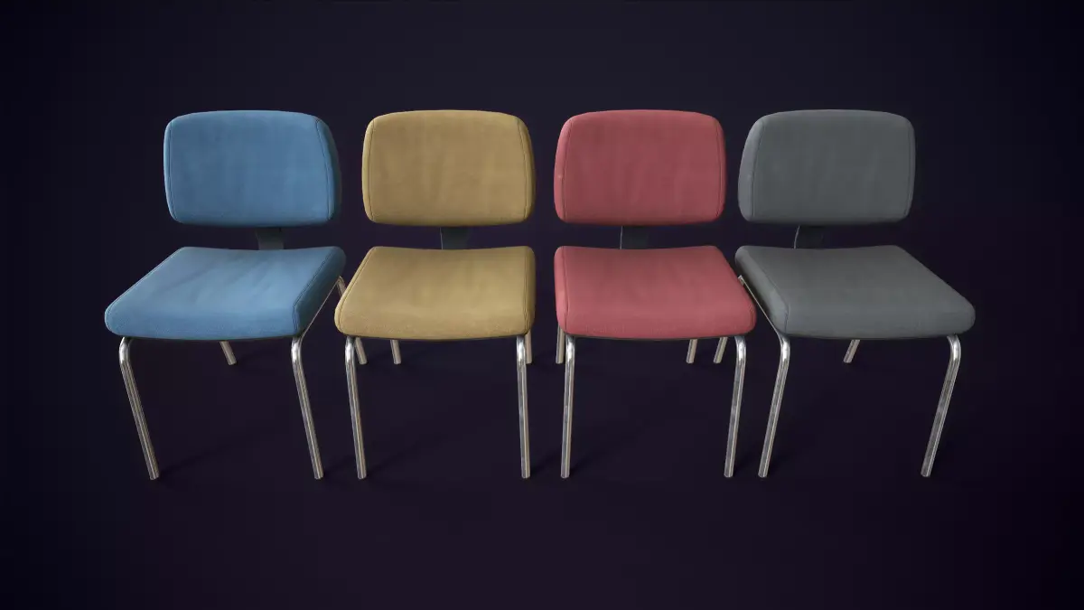 The model includes four different color variations for the upholstery: blue, yellow, red, and grey.