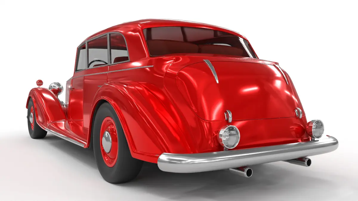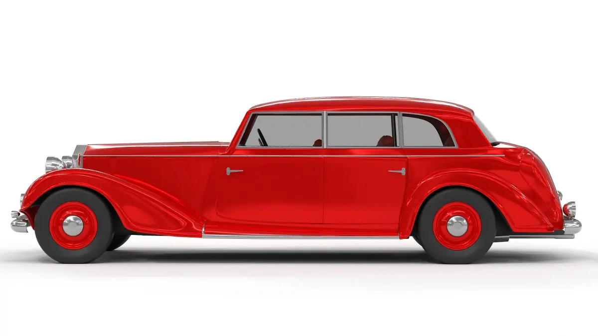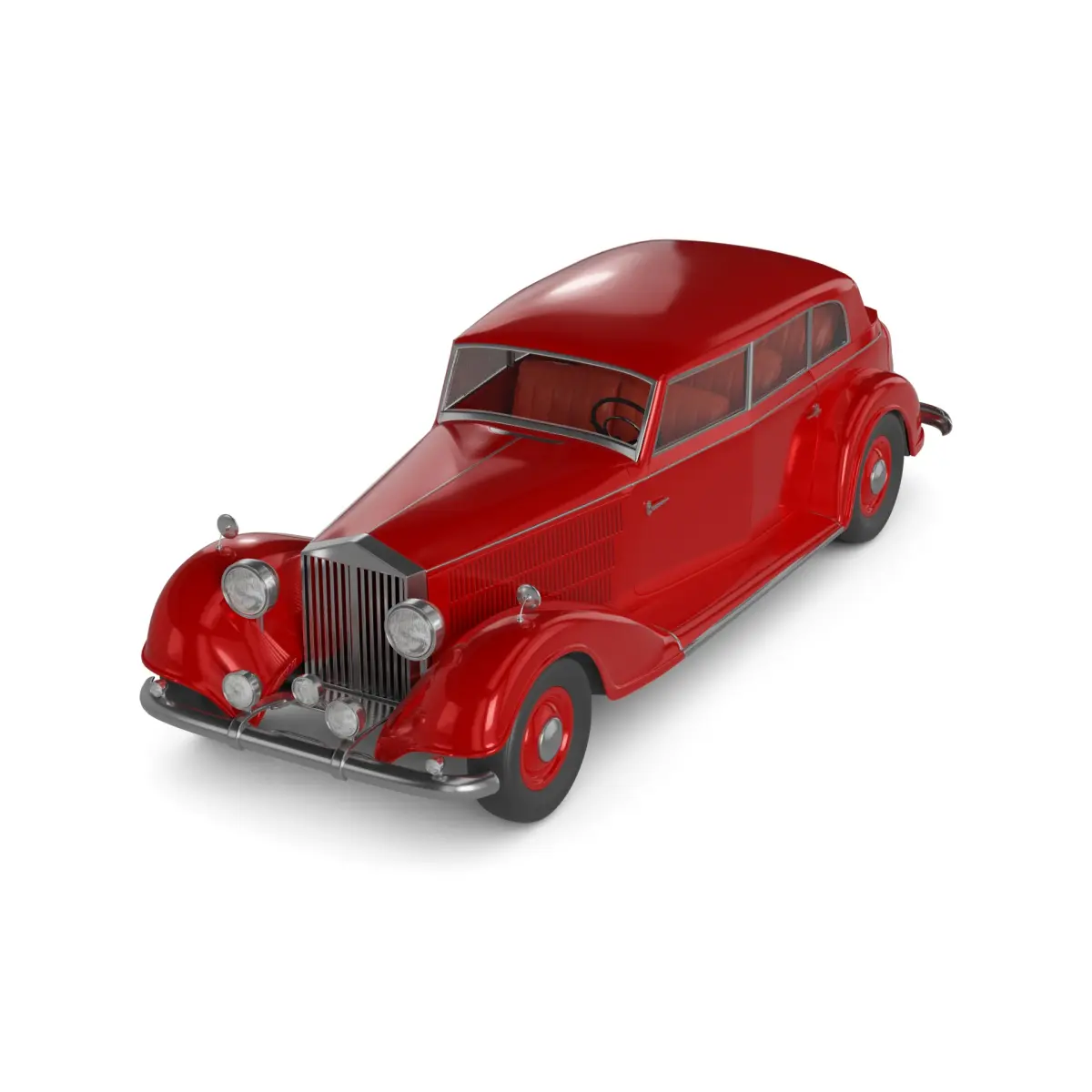 A vintage sedan car from the historical timeline, characterized by its boxy silhouette, vibrant red color, and leather interior, exuding a sense of luxury and sophistication.