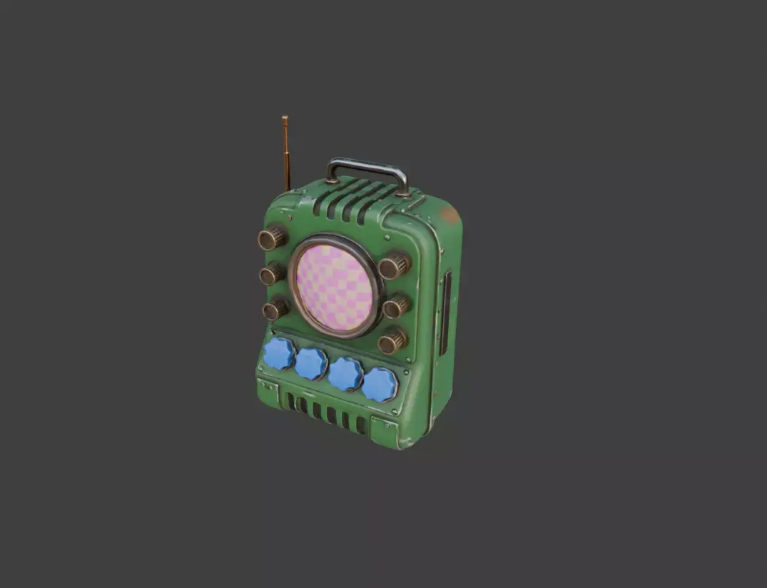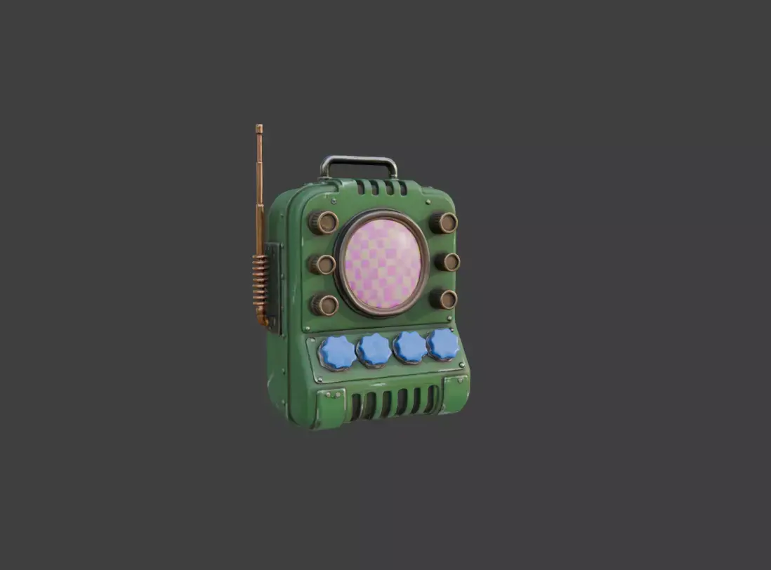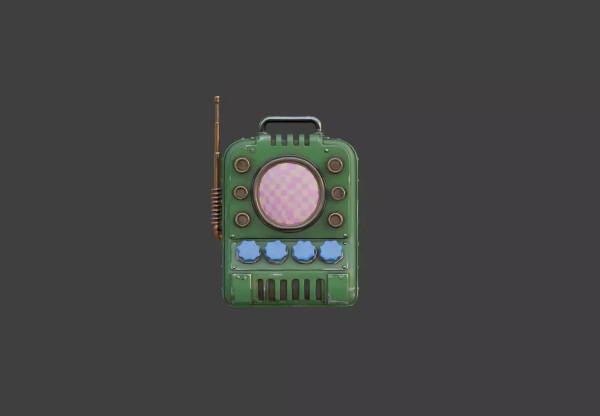 An antenna protrudes from the top, suggesting long-range transmission or reception capabilities. Meanwhile, the metallic handle indicates that the device is meant to be mobile—carried by technicians, explorers, engineers, or operatives who rely on it for instant data interpretation in the field. Whether used for communication, scanning, analysis, or energy modulation, the Retro Signal Synthesizer Device feels like a bridge between eras—something that could belong equally in a dieselpunk world, a sci-fi colony, or a post-apocalyptic setting where technology is repurposed into ingenious new forms.