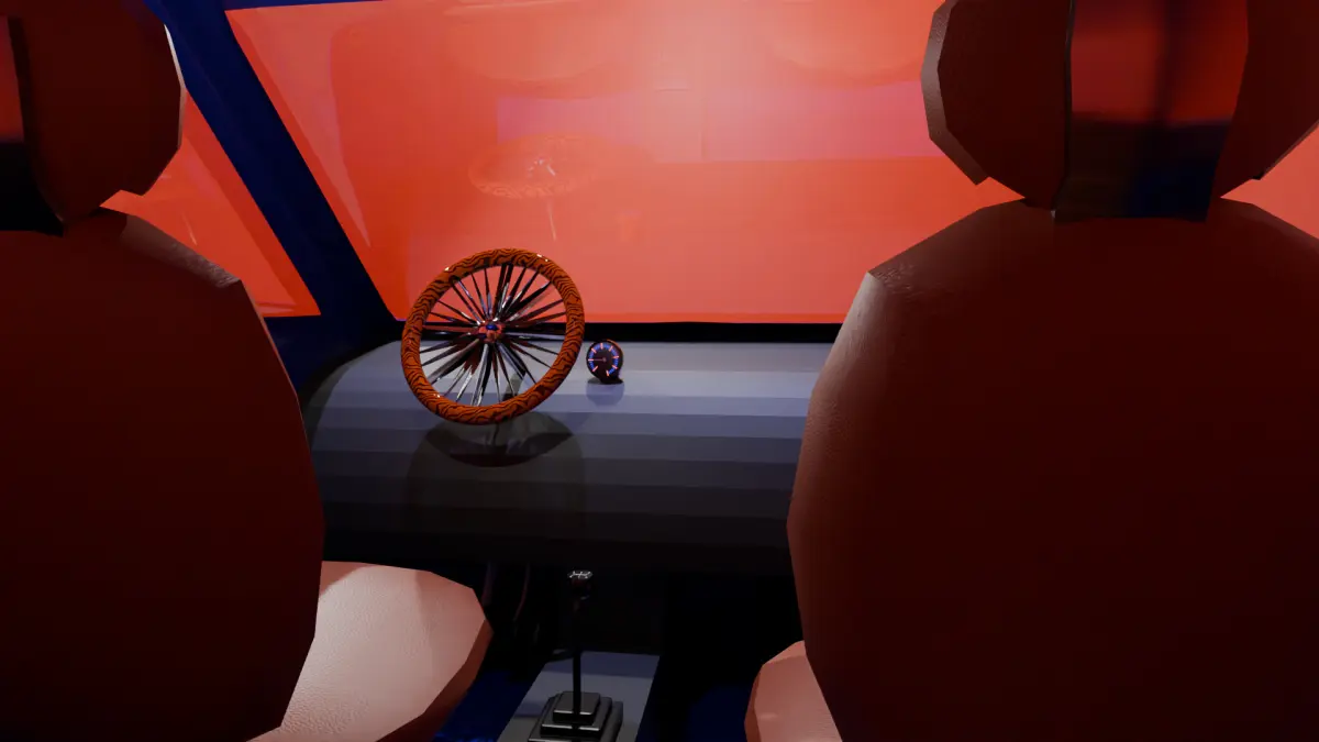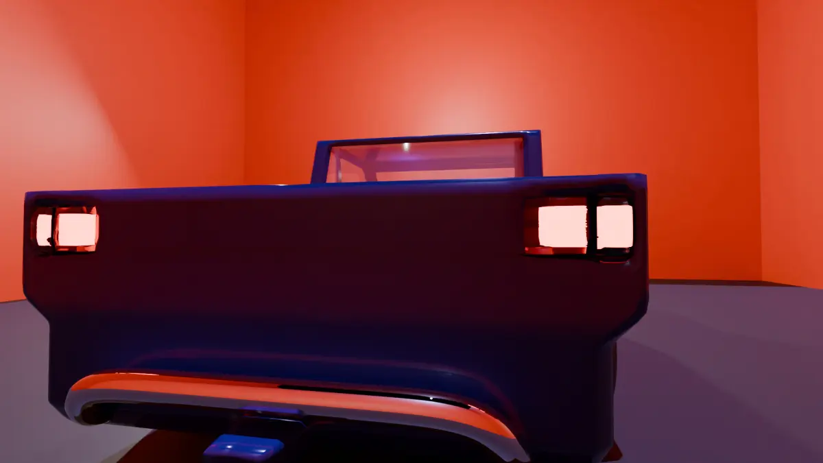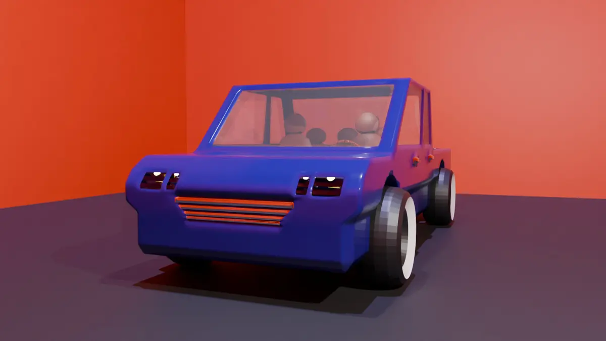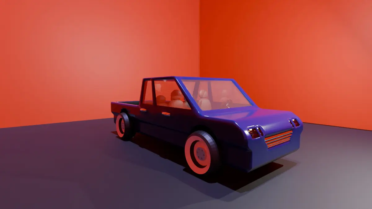 Modeled and rendered in Blender, this pickup truck features a vibrant blue finish and a simple yet effective interior, including seats and a steering wheel. Its stylized design with blocky forms and distinct headlights/taillights gives it a unique character.