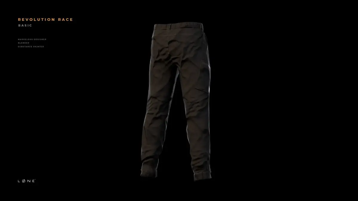 Revolution Race Basic Pants StyleMade with Marvelous Designer, textured in Substance Painter, OBJ / FBX / DAE files included, low poly quads, easy to skin, 4K materials.Let me know if you encounter any trouble, i'll help, your feedback will be appreciated.