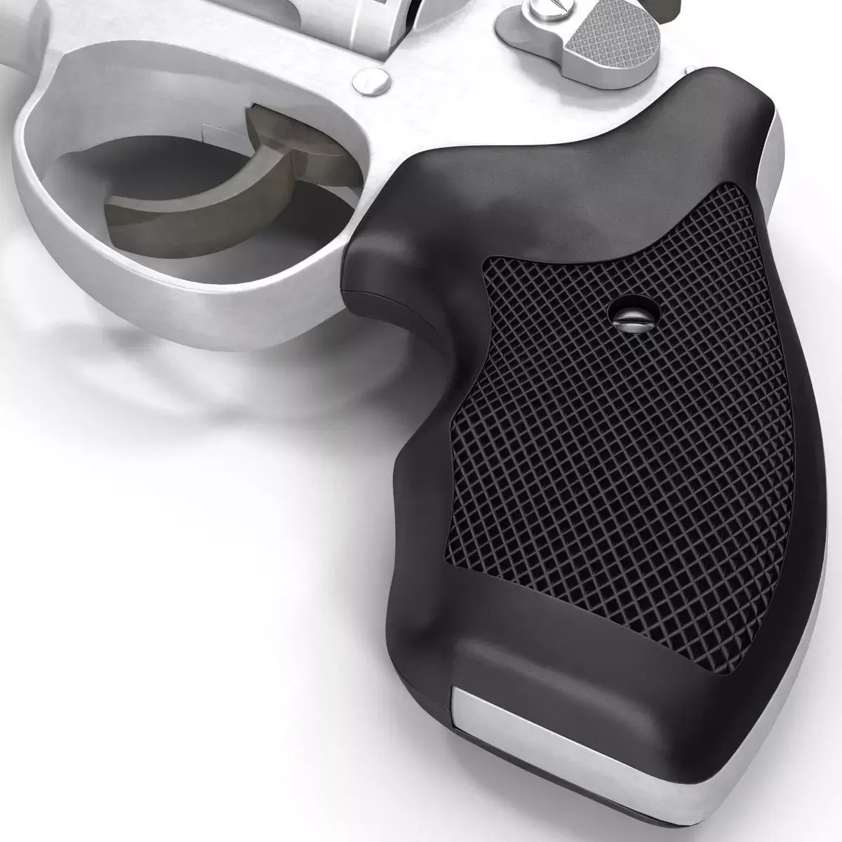 The model features a detailed metal frame, rotating cylinder, trigger guard, hammer, and textured grip panels. Accurate proportions, realistic surface materials, and clean geometry make it suitable for high-quality renders and close-up visualization. The mechanical elements are carefully modeled to reflect the recognizable structure of a traditional revolver design.