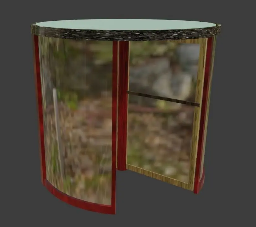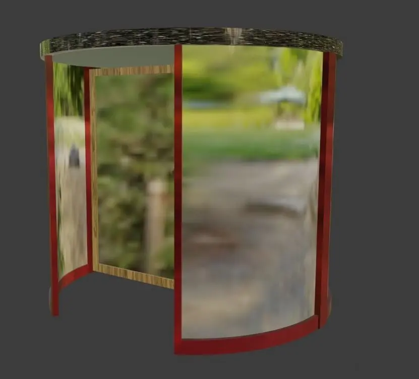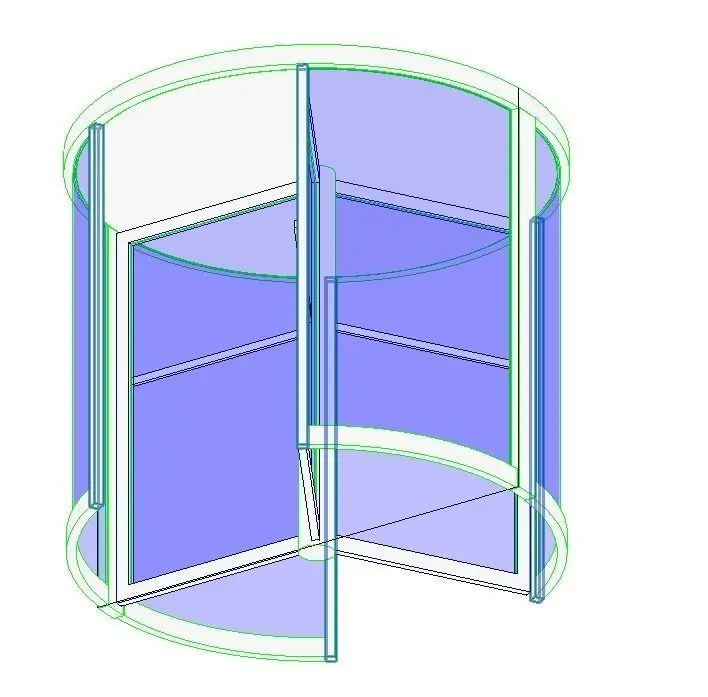 Exterior revolving door, 3 glass panels, steel frame, glass enclosure