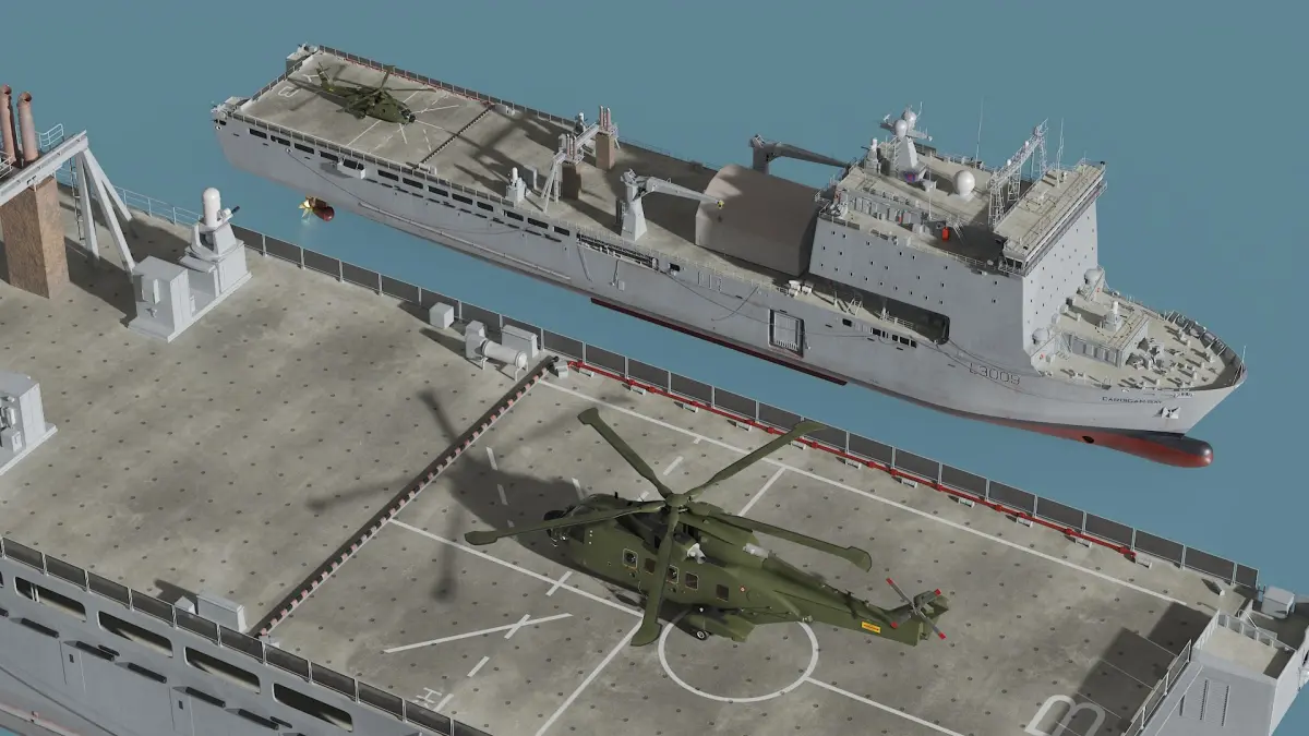 RFA Cardigan Bay Landing Ship with AW 101 Merlin Helicopter is a three-dimensional model of a naval support vessel, designed to provide logistical and operational support to naval fleets.