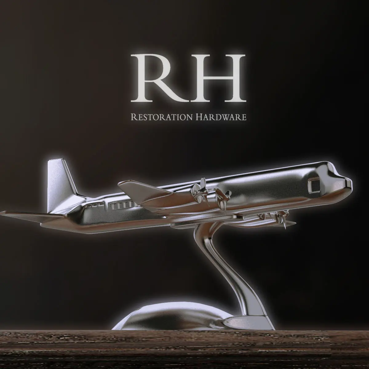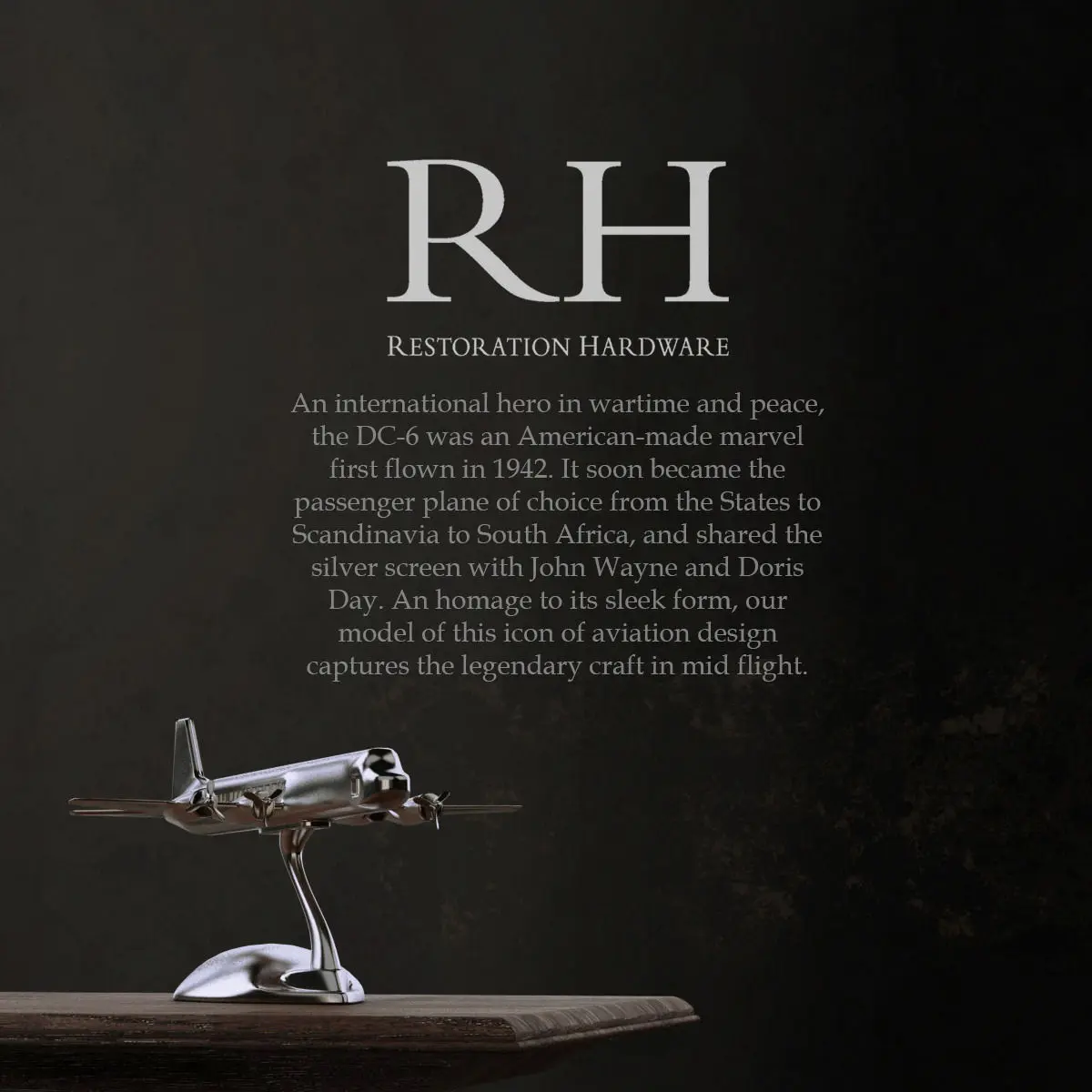 DC-6 PLANE MODEL$449 Special $399An international hero in wartime and peace, the DC-6 was an American-made marvel first flown in 1942. It soon became the passenger plane of choice from the States to Scandinavia to South Africa, and shared the silver screen with John Wayne and Doris Day. An homage to its sleek form, our model of this icon of aviation design captures the legendary craft in mid flight.