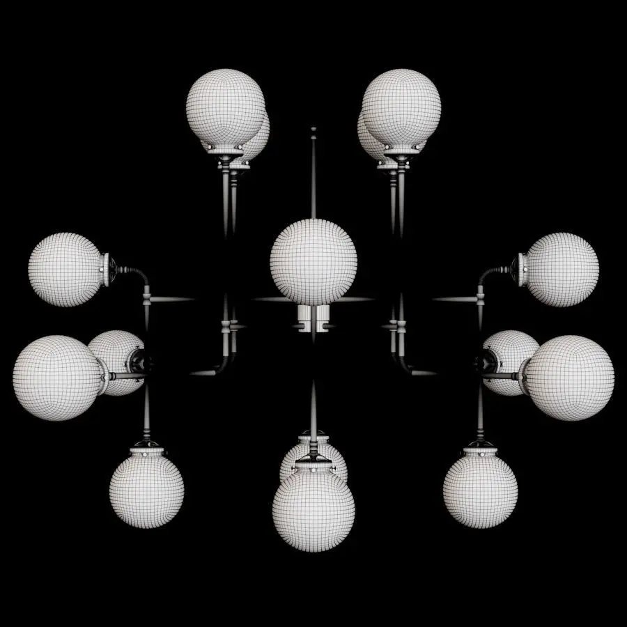 Inspired by 1940s industrialism, our globe chandelier's lines and spheres are reminiscent of an urban subway map. Twelve glass shades are joined by metal tubing and carefully balanced on vertical threaded rods.