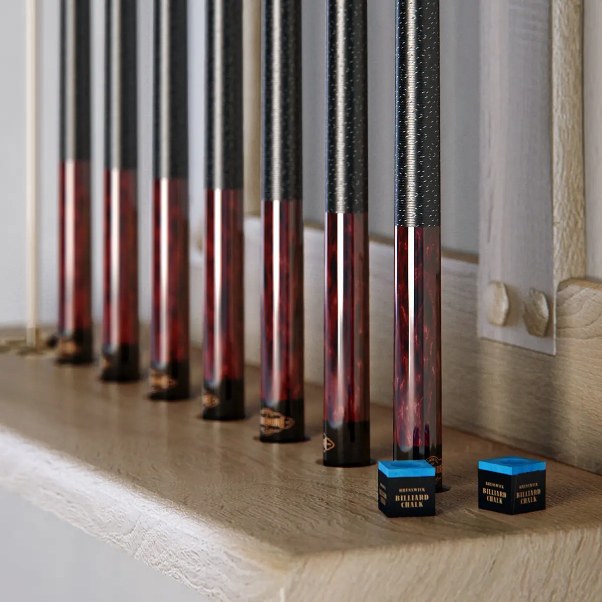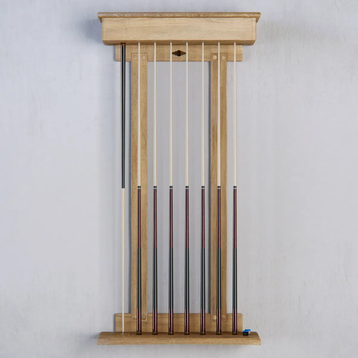 In this scene:- a cue rack- set of cues (x7)- bridgehead cue- set of chalks (x2)