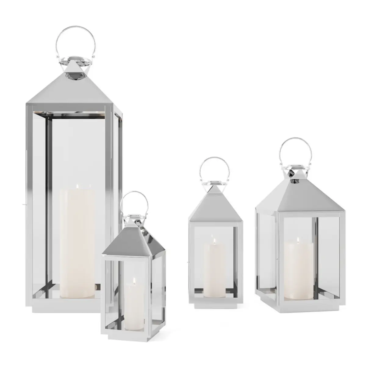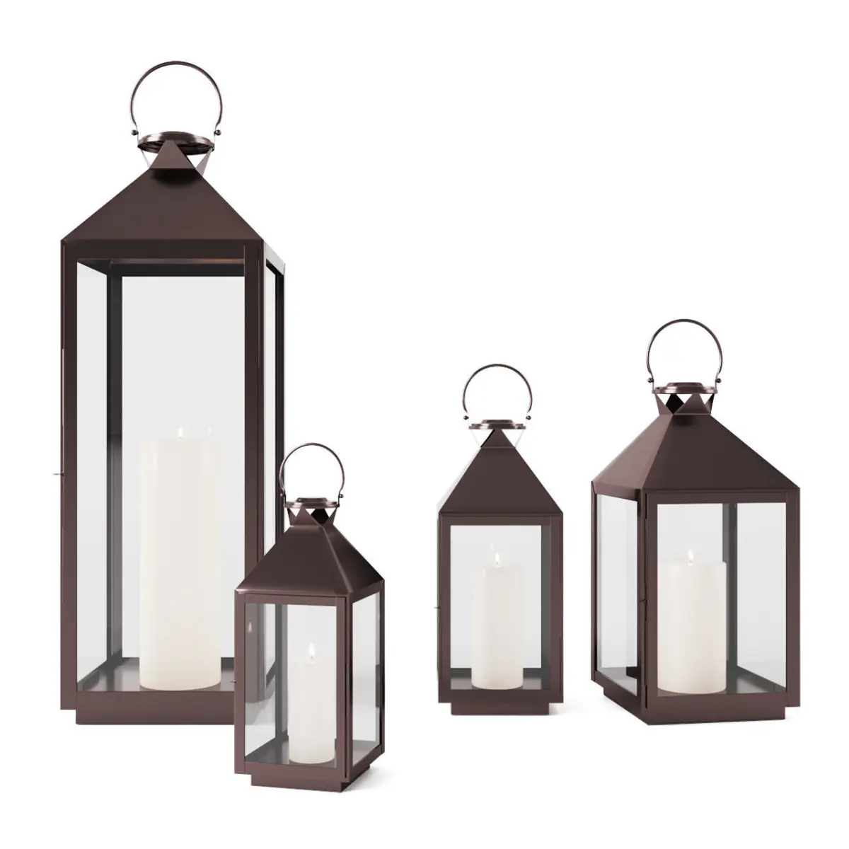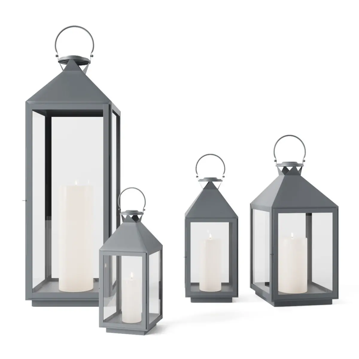 Our minimalist lanterns let the flicker of candlelight take center stage.Solid sheet metal frames feature broad panels of clear glass.Fitted with handles, the lanterns can be easily transported tocast a warm glow where needed.