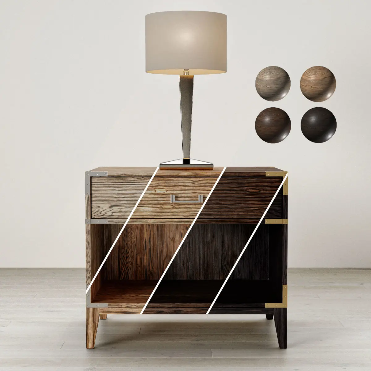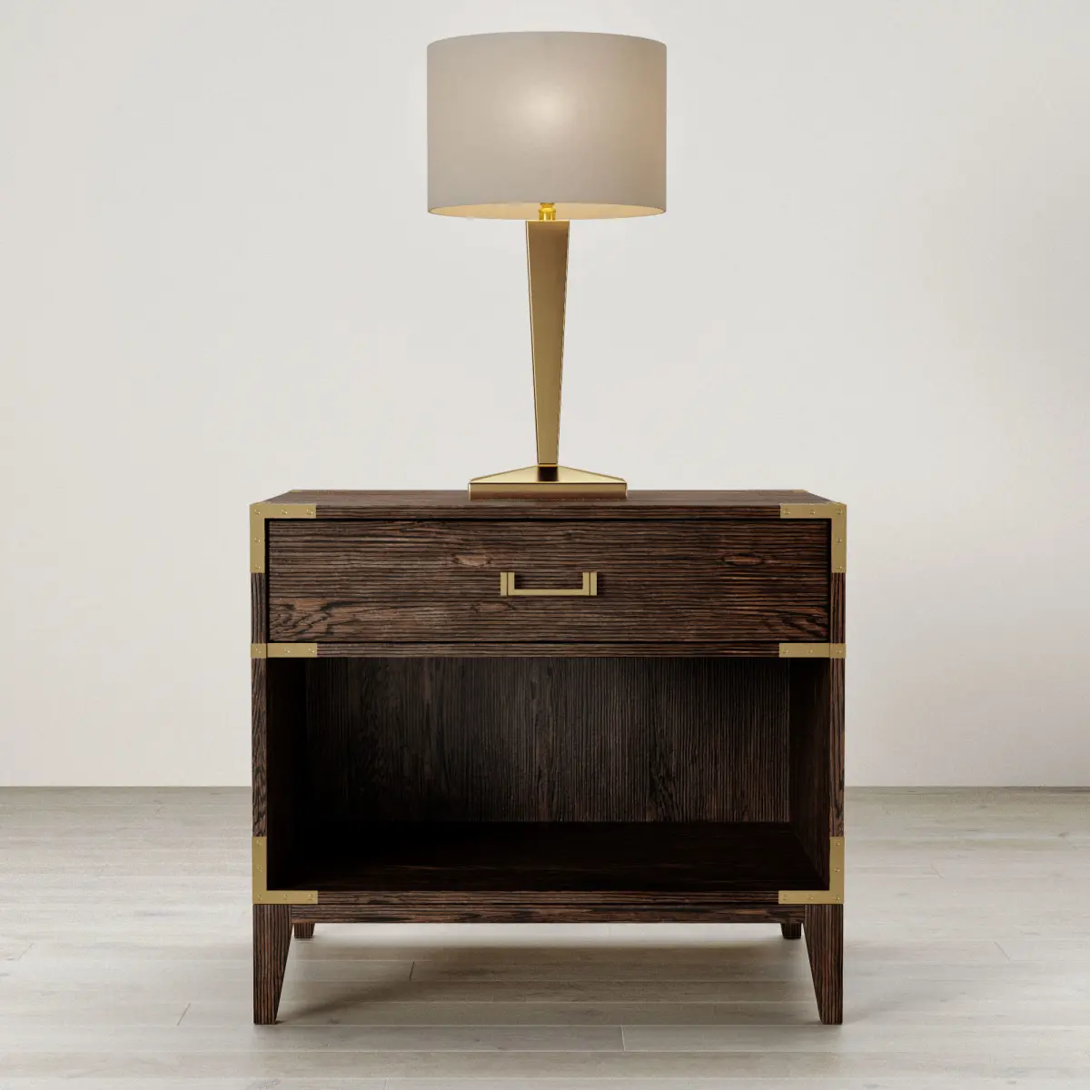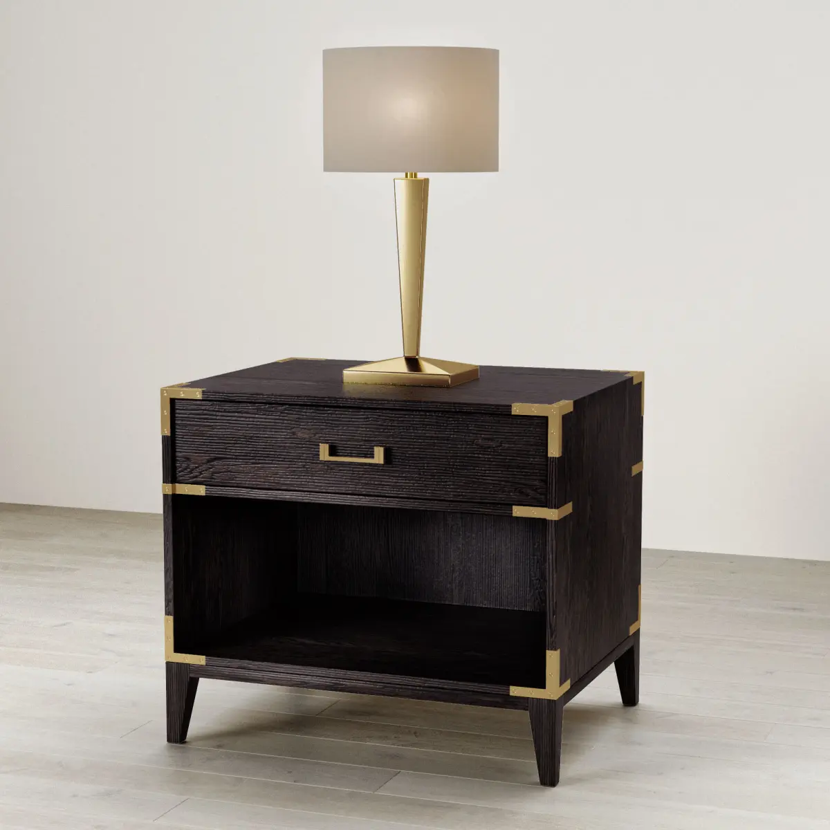 This is an inspired 19th century european campaign furnishing by Restoration Hardware. It is made of rustic solid oak and the hand-cast metal harware with corner brackets add accent to this piece. Comes with 4 oak materials and 2 metal materials. This is the 26''W x 20''D x 28''H version. The drawer can be opened as well. It comes with the Niermann Weeks Augusta table lamp.