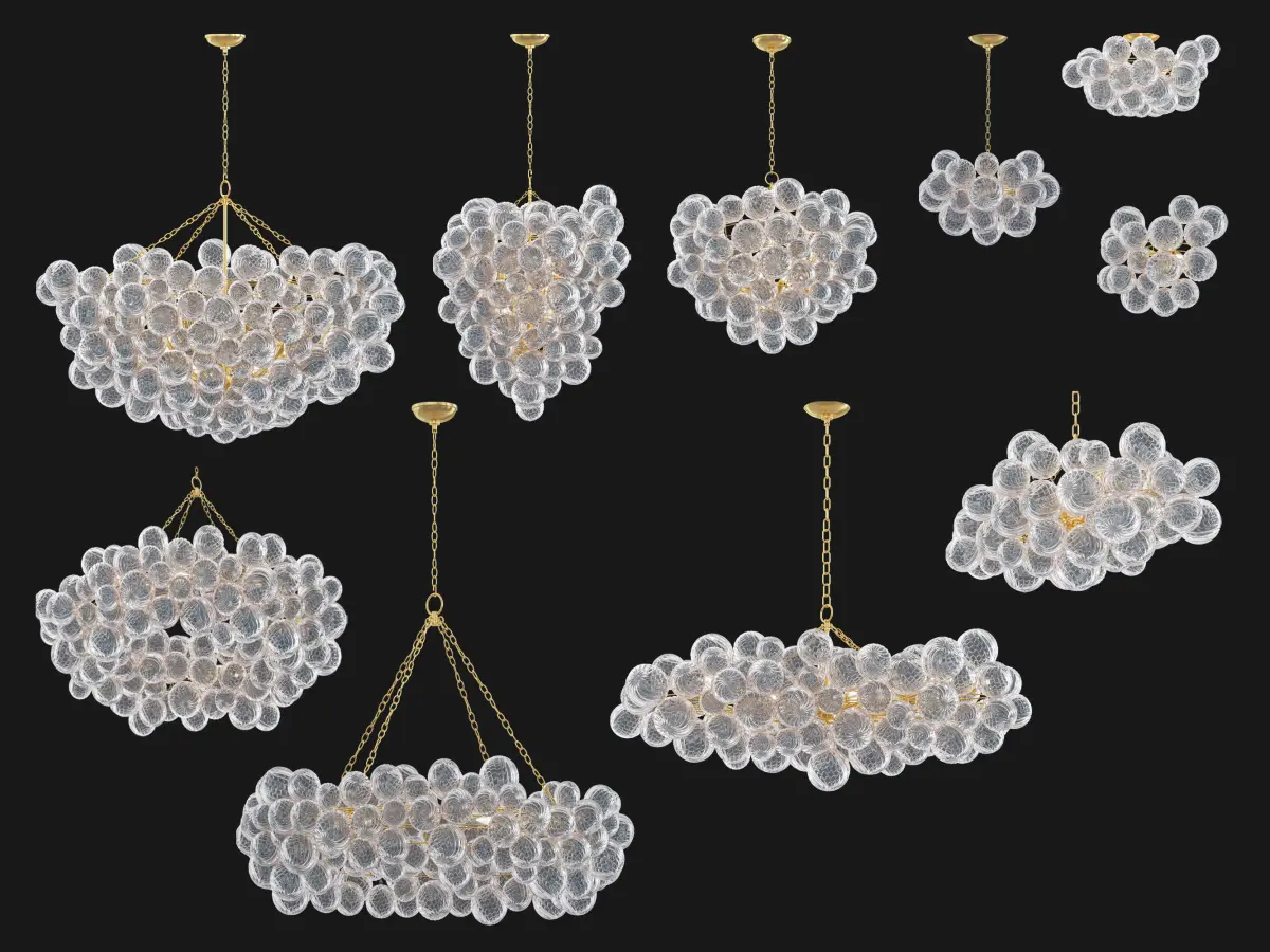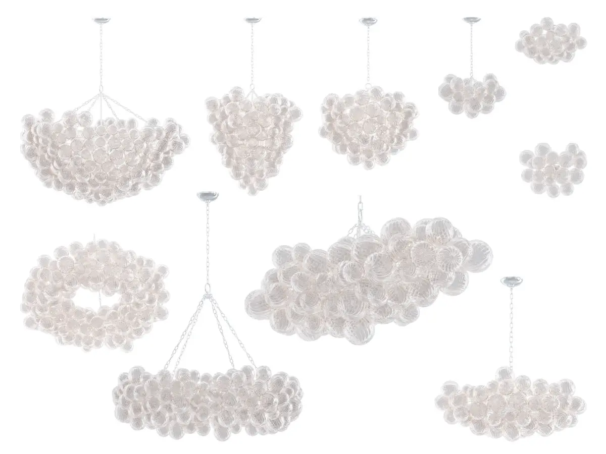 The Talia sconce features a cluster of 18 blown swirled-glass orbs that appear weightless, floating like bubbles around a metal frame, reflecting ripples of light through the richly textured surface. Designer Julie Neill reimagines classic glass globe fixtures to create this elevated collection of distinctly modern statement pieces.