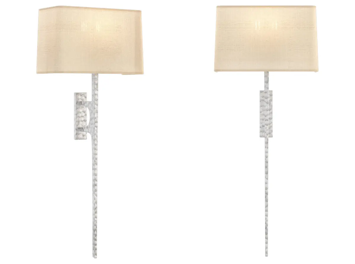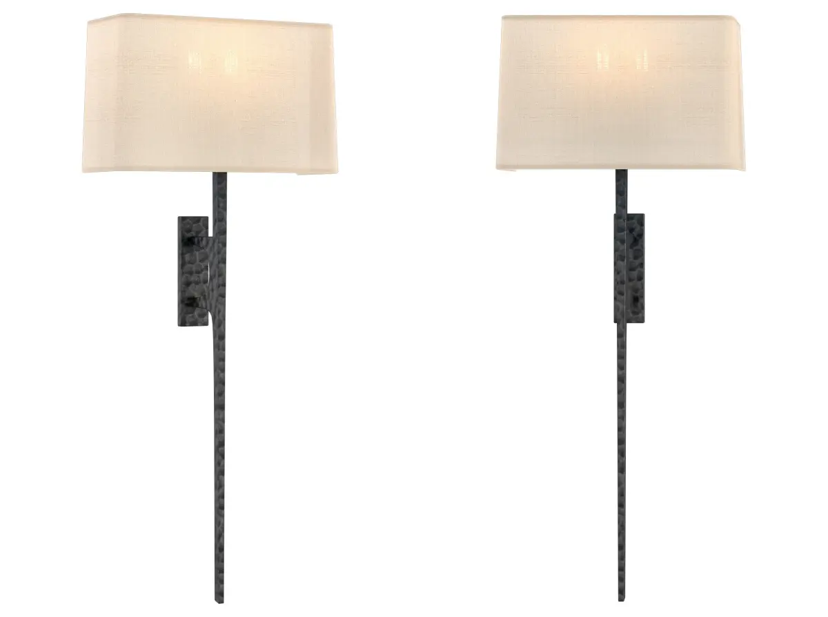 Spare and elegantly minimal, our fixture by Ian K. Fowler defines refined simplicity. A hand-forged, hammered metal frame – its arms perfectly tapered – showcases tailored white linen shades. An exercise in balance and proportion, it conjoins light and dark, crisp right angles and understated curves.
