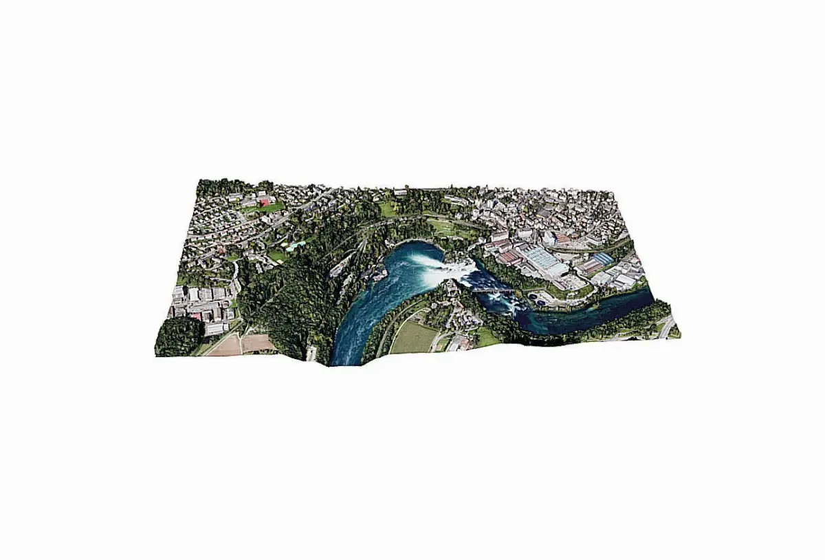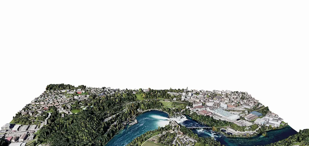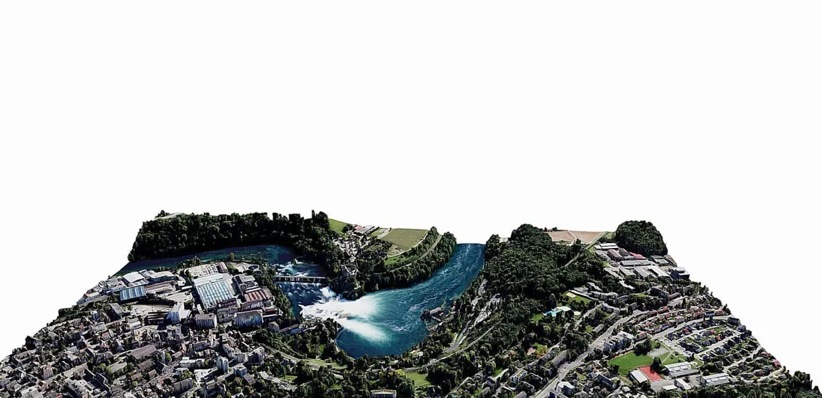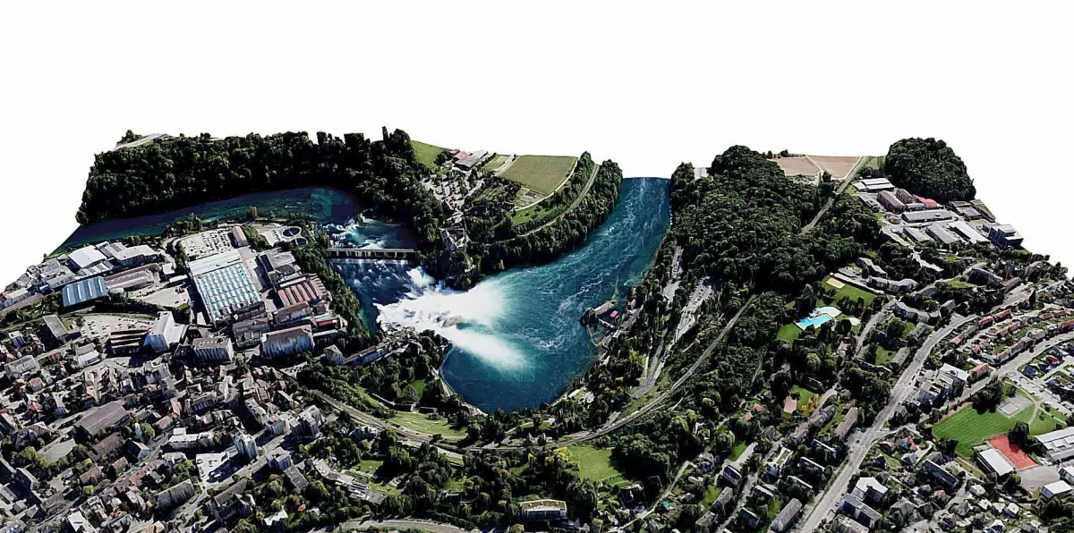 The Rhine Falls (German: Rheinfall, pronounced [ˈʁaɪ̯nˌfal] (About this soundlisten), singular) is a waterfall located in Switzerland and the most powerful waterfall in Europe.[2][3][1] The falls are located on the High Rhine on the border between the cantons of Schaffhausen (SH) and Zürich (ZH), between the municipalities of Neuhausen am Rheinfall (SH) and Laufen-Uhwiesen/Dachsen (ZH), next to the town of Schaffhausen in northern Switzerland.They are 150 metres (490 ft) wide and 23 metres (75 ft) high. In the winter months, the average water flow is 250 m3/s (8,800 cu ft/s), while in the summer, the average water flow is 600 m3/s (21,000 cu ft/s). The highest flow ever measured was 1,250 cubic metres per second (44,000 cu ft/s) in 1965; and the lowest, 95 cubic metres per second (3,400 cu ft/s) in 1921.[1] The falls cannot be climbed by fish, except by eels that are able to worm their way up over the rocks.https://en.wikipedia.org/wiki/Rhine_Falls