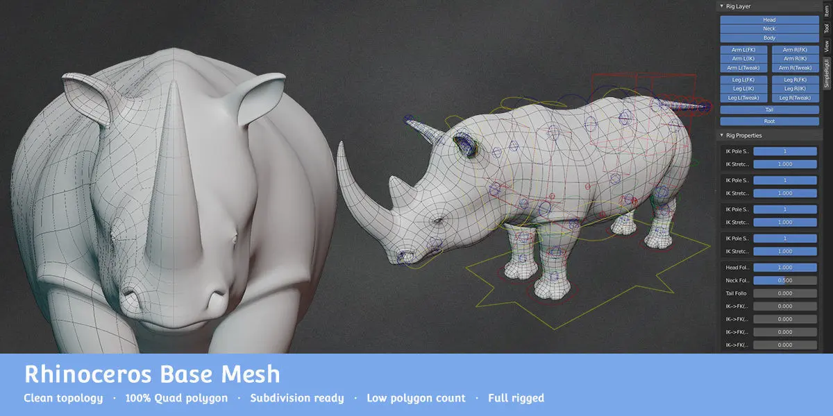 A advanced quadruped rigged, clean topology rhinoceros base mesh to help increase your productivity!
