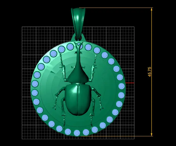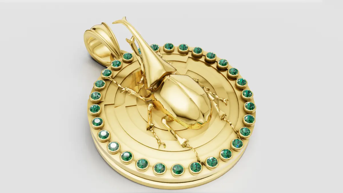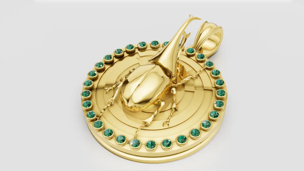 This bold and intricate 3D pendant design features a highly detailed rhinoceros beetle motif, meticulously crafted in polished yellow gold. The sculpted beetle rests atop a circular disc with concentric engraved lines, symbolizing strength and precision. Surrounding the disc is a brilliant arrangement of green gemstones, adding vibrant contrast and a luxurious finish to the design. The long curved horn of the beetle adds dramatic character, making this piece perfect for nature lovers, collectors, and those seeking a truly unique statement pendant. Ideal for high-end jewelry rendering, 3D printing, and precision jewelry manufacturing.