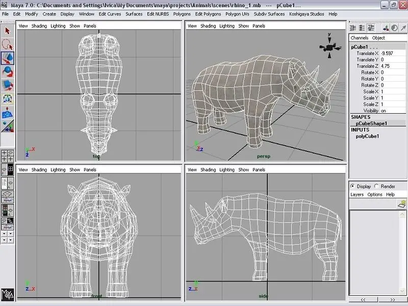 Rhinoceros model for games, educational, visualization and other purposes.UV mapped and textured, made with Maya 7.Maya 7 (.ma, .mb), OBJ (.obj), 3ds Max 2009 (.max) and Autodesk FBX (.fbx) format included.Polygons: 626 quads/ 1236 trianglesVertices: 622Edges: 1244UVs: 788Textures included in textures_rhino.zip file:-1024×1024 .jpg diffuse (color) map-1024×1024 .psd diffuse (color) map with layers