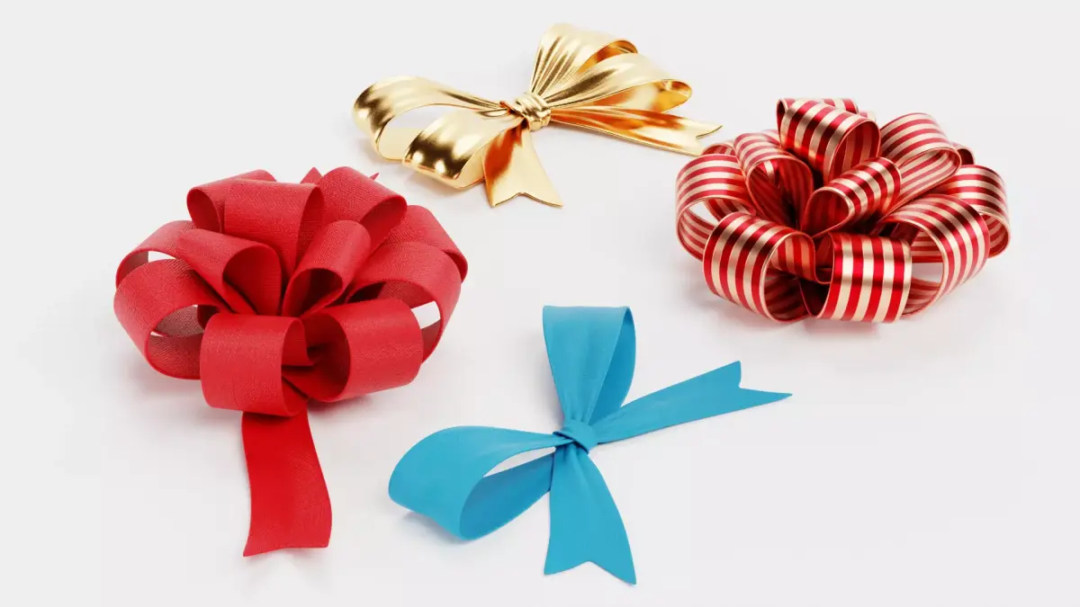 A complete set of four decorative bows covering a range of colors, shapes, and loop structures. The collection includes simple and multi-loop variants, glossy striped designs, and gold ornamental styles, offering a flexible asset pack for gift-wrapping scenes, product visualization, festive layouts, or decorative compositions. All models maintain clean geometry.