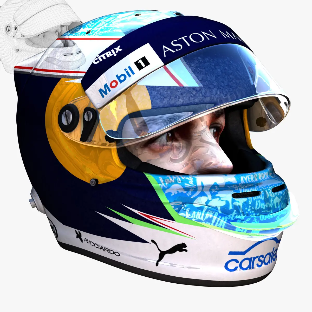 This is a 3D low poly model ,it was designed to provide a high definition in a low poly. Standard low-poly mesh with specific poly count. It`s the most accurate and realistic of the market. This is a recreation of a F1 Helmet model,it can suffer modification over the season. The model is completely ready for use visualization in maya. For low poly model simply press 1 and for the high resolution press 3. In Cinema4d go to function menu and subdivide. In 3dmax meshsmooth In the low poly: Poly count : 6641Vertex count : 6954In the smooth version: Poly count : 135856Vertex count : 2137026Textures included. Each texture is in jpg format and have a 4K texture resolution for high quality It has color texture Because of different Disk topology at different computers it might be required to change the textures path at the destination computer. The 3D model was created on real base. It's created accurately, in real units of measurement, qualitatively and maximally close to the original.