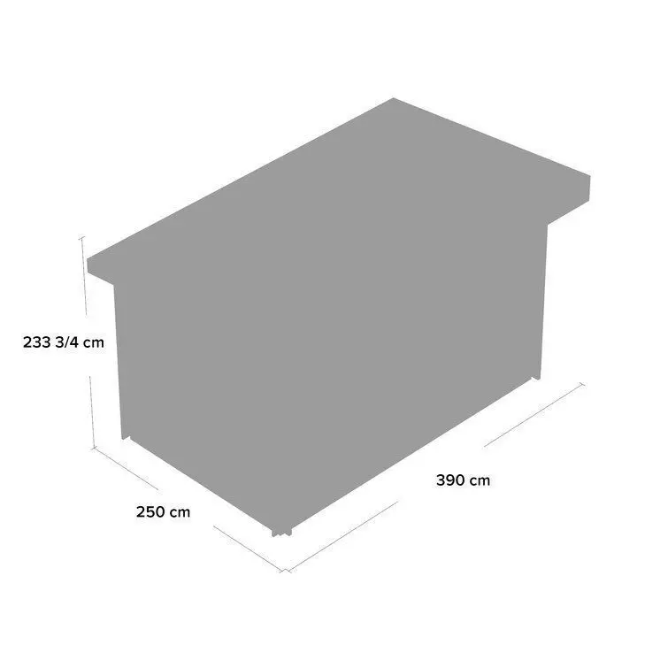 - 390cm W x 250cm D x 233.7cm H