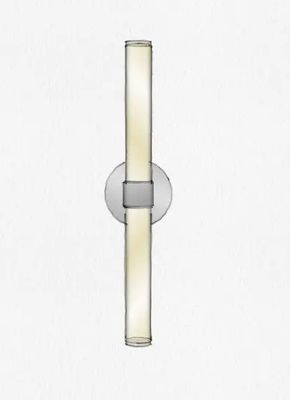 Rigdon Double Tube Wall Sconce by Rejuvenation. The sleek design of this hardwired fixture features a coining technique, which emphasizes its form and connections. The Rigdon features a glass shade, brass components, and brushed nickel finish. https://www.rejuvenation.com/catalog/collections/rigdon-double-wall-sconce/products/5c3cf7a9793a1b396ffea03e