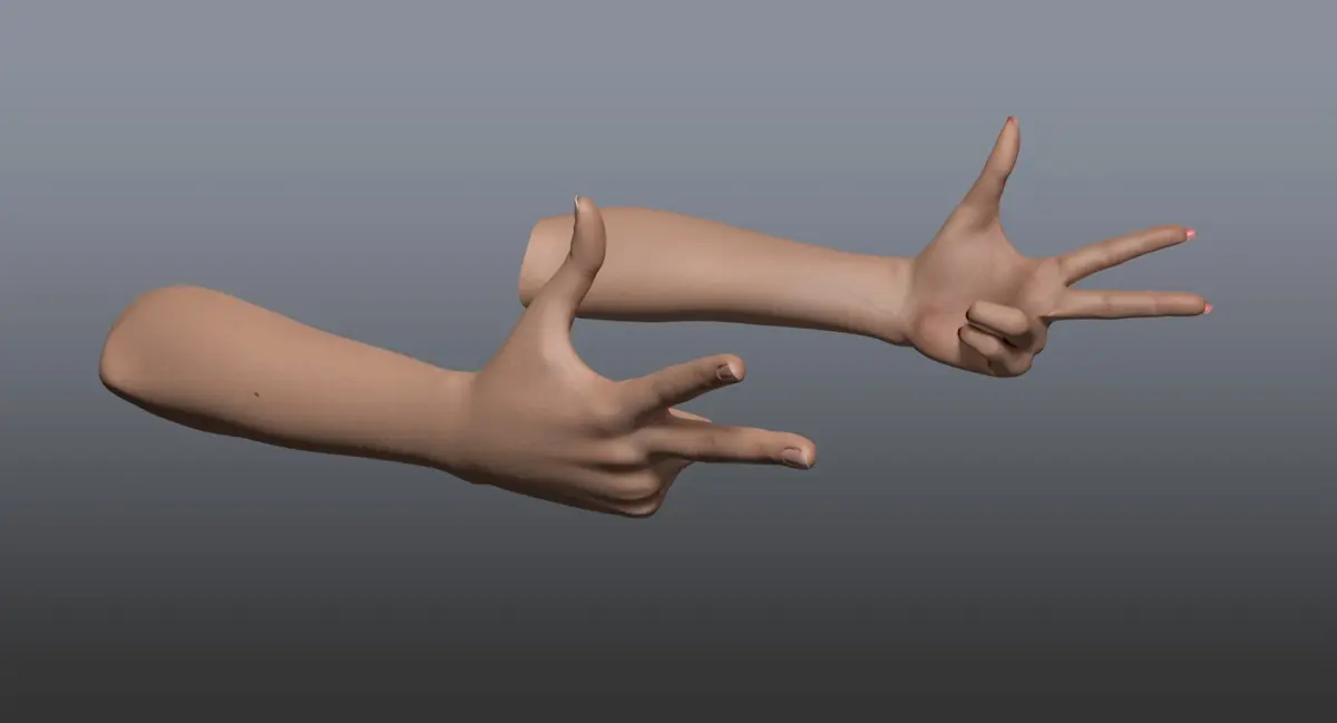The left-hand-model is essentially a flipped copy of the right-hand-model. Both models share the same UVs and textures.The rig and the poses have also been flipped and the user data nodes of the left-hand-model have been adjusted to accommodate the flipping.