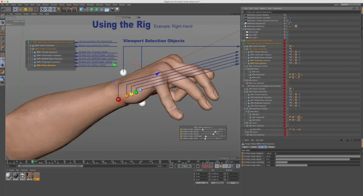 The easy to use custom rig has been built especially for this model. For each hand there is only one Controller-Object to move and rotate the hand. The rotations of the finger-joints are all controlled via sliders in the attribute-manager or HUD. Special Selection-Objects make it easy to select the controllers in the viewport. See the preview-image for details.