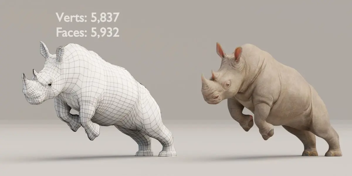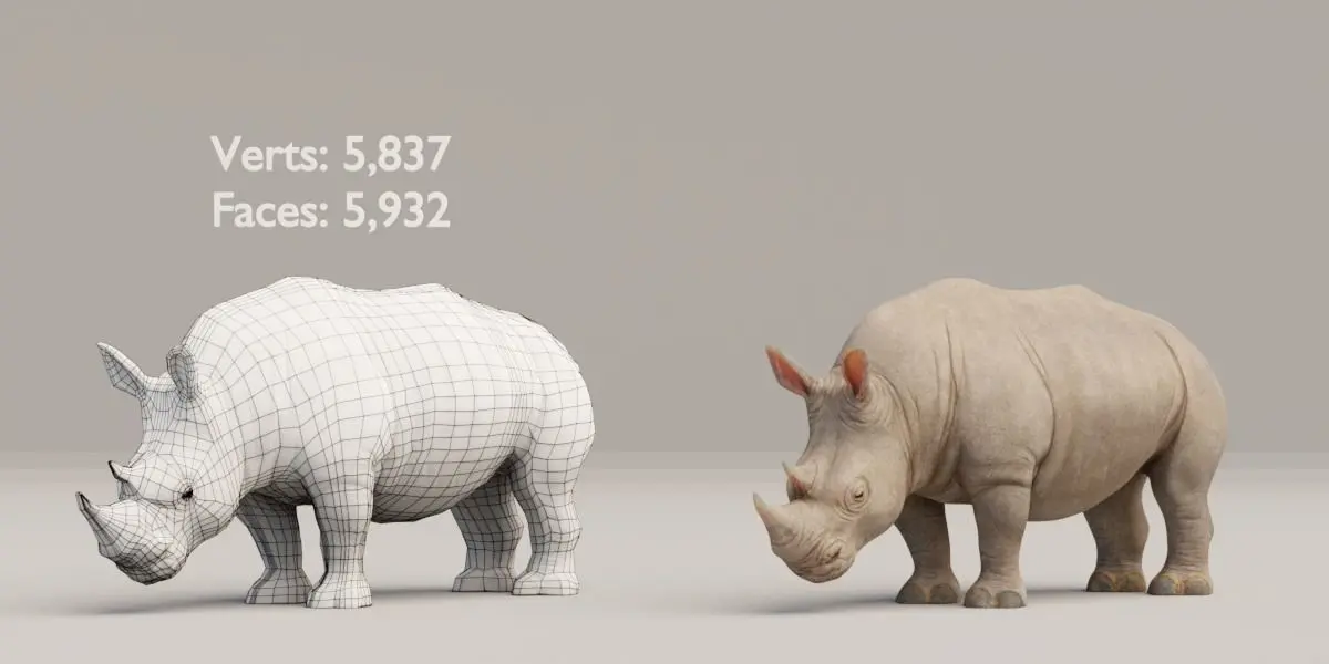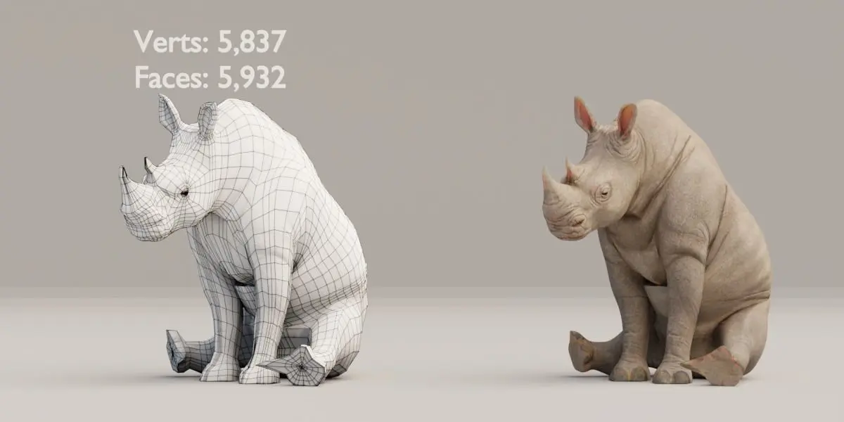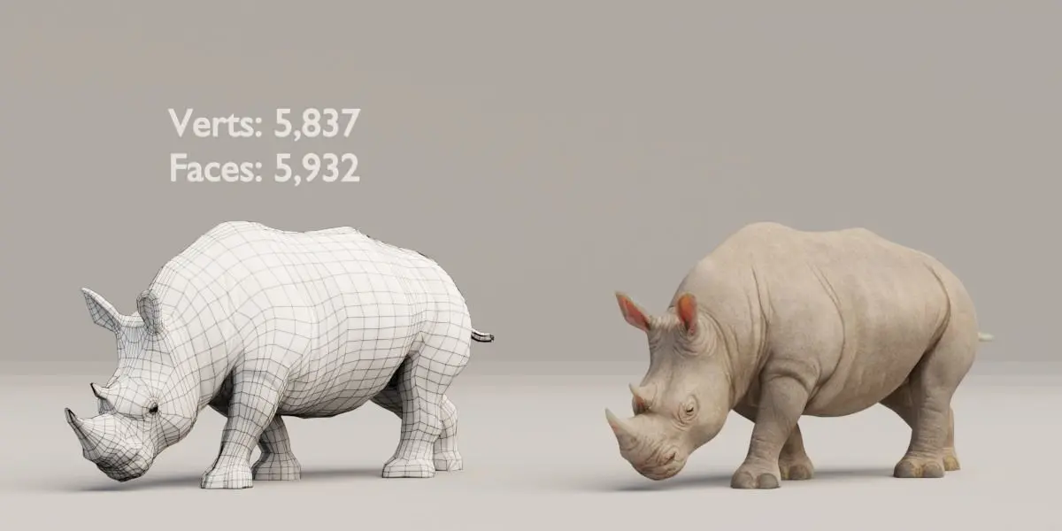 v2.9 .blend fileRendering in Cycle.zip file for downloadAdult Rhino Verts: 5,837 Faces: 5,932Baby Rhino Verts: 4,343 Faces: 4,4904k Textures*Poses included*Wall, Floor not included in the file