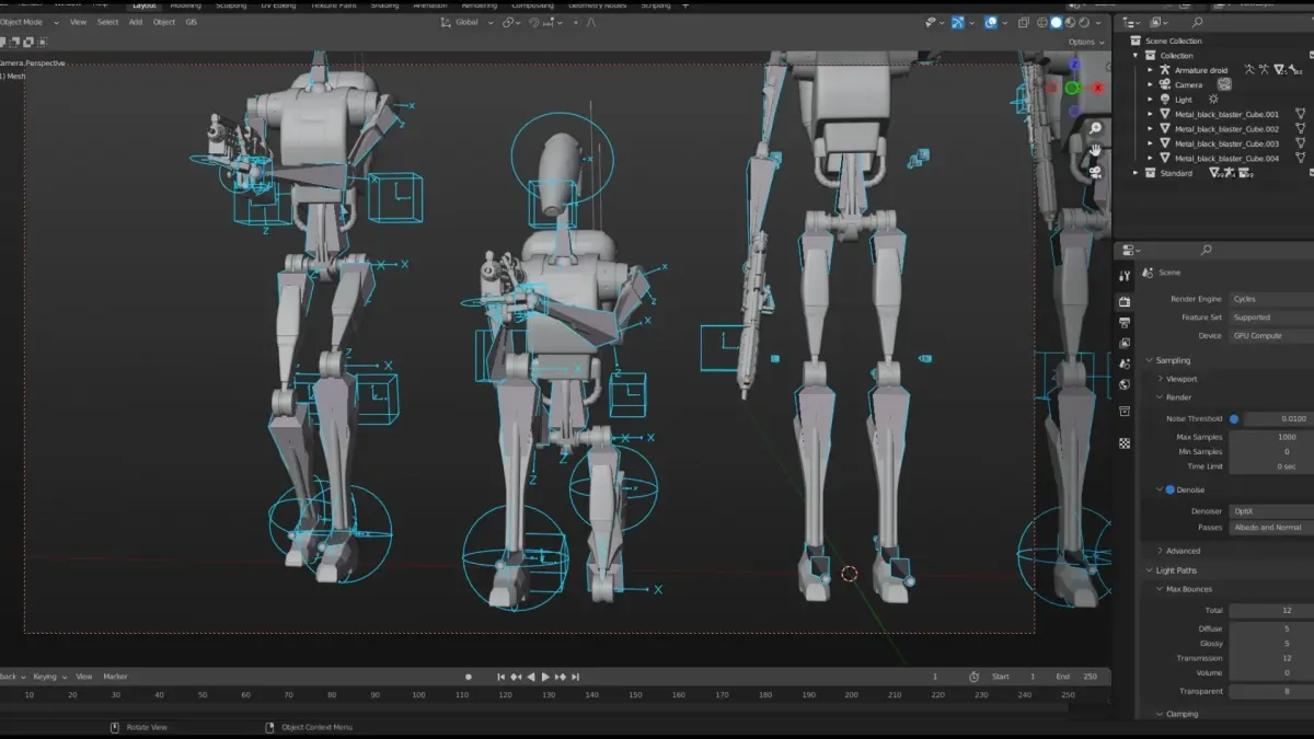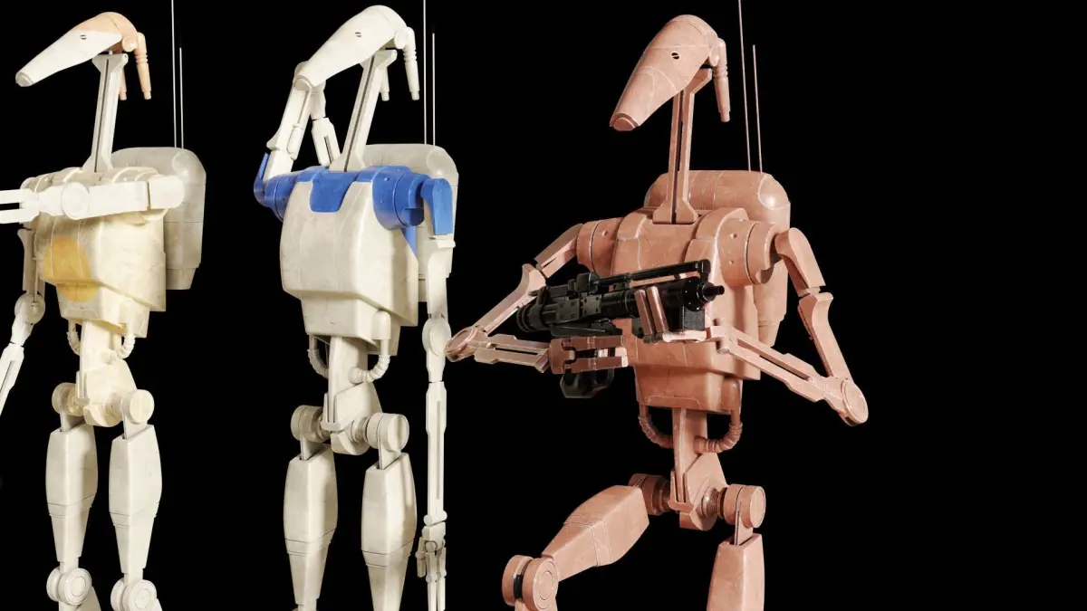 This model contains 1 droid .FBX with armature, 1 Blaster .OBJ, 1 blender file containing the constraints ready on armature, 1 texture files for the baster and droids, droids contain texture file with (AO, diffuse, Specular, Metallic, Roughness, Normal), please read the TXT file containing instructions.