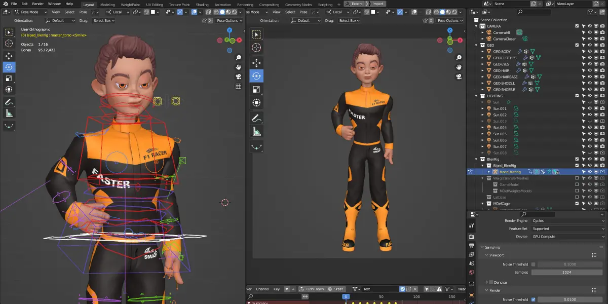 The character has rigged using BlenRig 6 Addon.