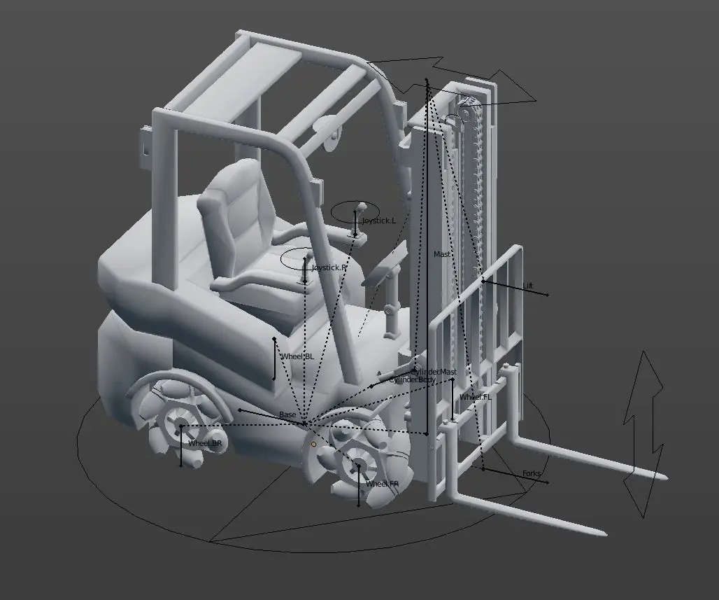 Model is rigged in Blender with working chains and automatic wheel movement.Controls for:Forklift movementForklift RotationMast liftMast tiltJoysticks