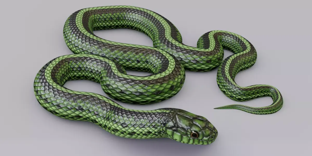 Rigged game ready green snake model setup with PBR textures in Blender 2.80, ready for animation and rendering with eevee and cycles.The model has clean topology and non overlapping UV. Most suitable for close up vfx shots and renders, animation and real time projects.Default render set up is eevee but can be switched to cycles.