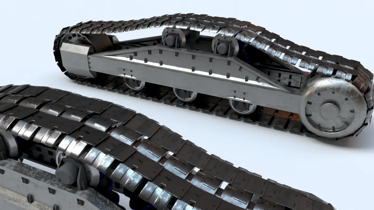 A great quality rigged 3D model of some Tank tracks, or continuous tracks. (a system of vehicle propulsion used in tracked vehicles, running on a continuous band of treads or track plates driven by two or more wheels).