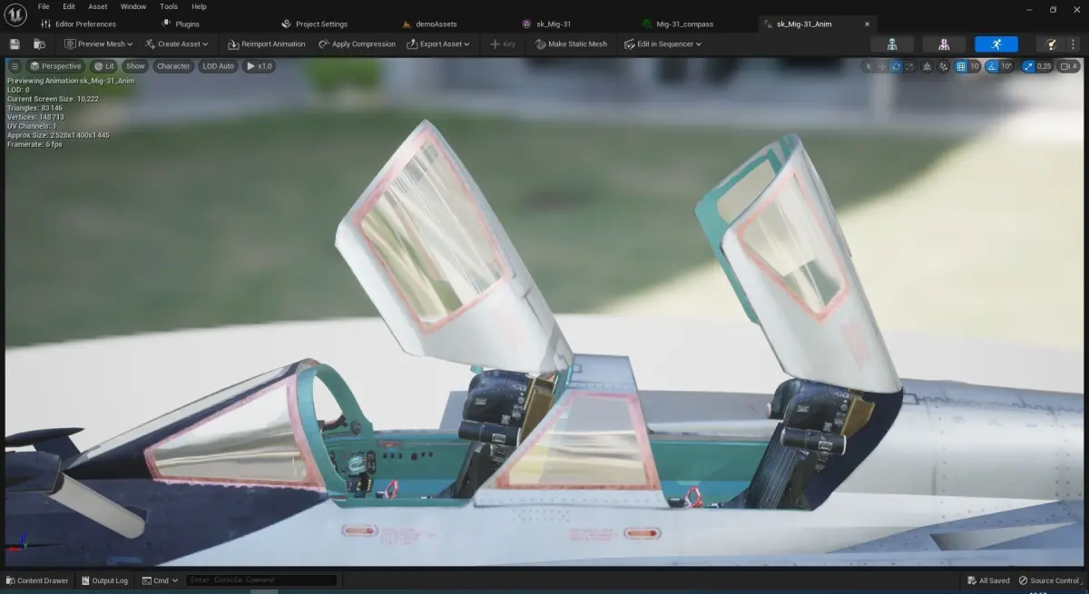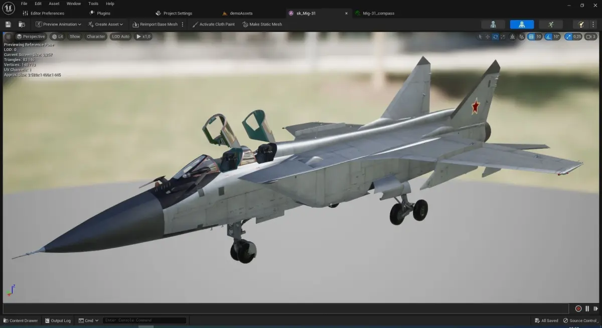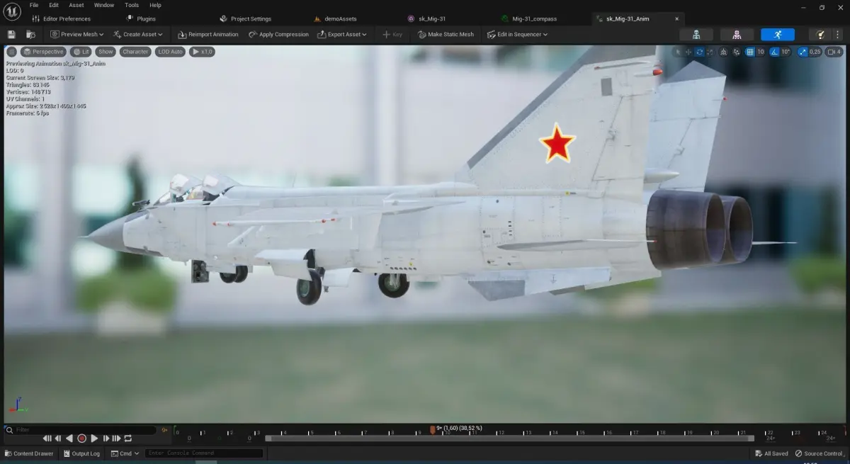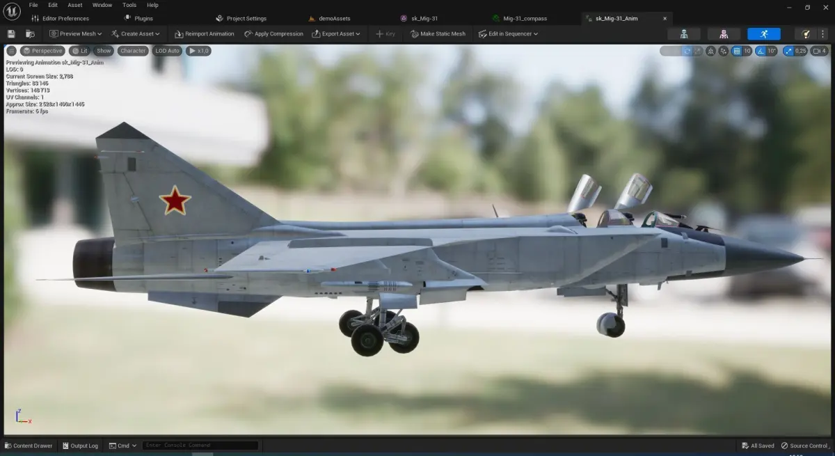 This highly detailed 3D model of the MiG-31 fighter jet is designed for professional use in 3ds Max, exported to FBX format, and fully optimized for Unreal Engine 5.1 (with .uassets integration). The model features a fully rigged skeletal system, enabling realistic animations and precise control over all movable components.