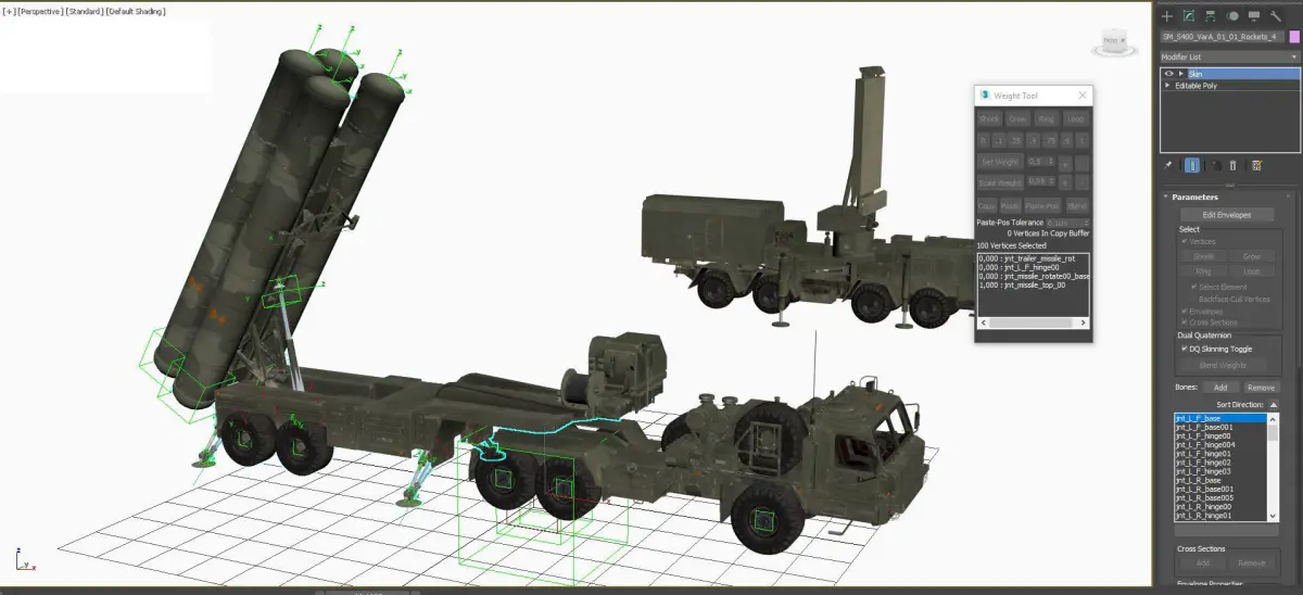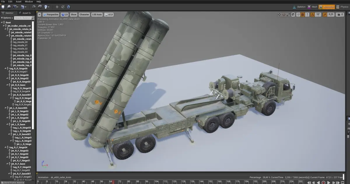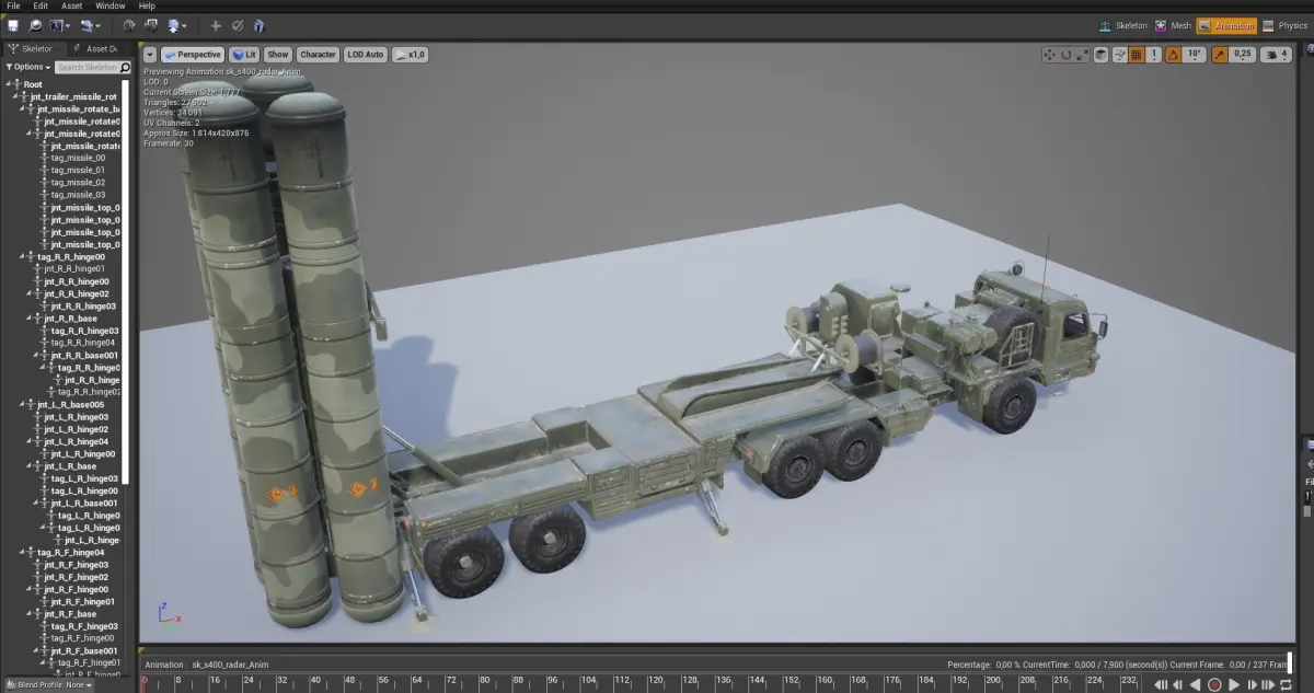 Rigged and animated all the movable parts, missile launcher, tires, truck, trailer, etc.