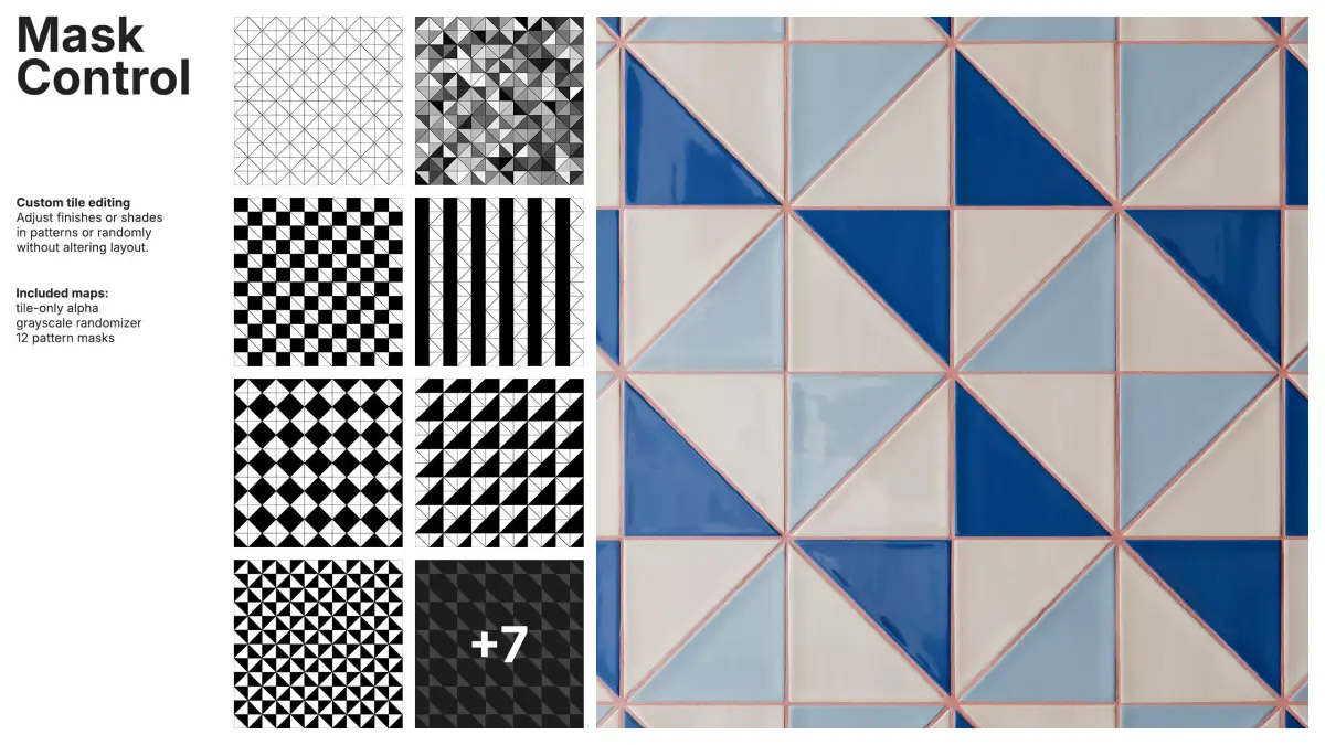 Pattern and random masks allow independent control of tile and grout colors, enabling global, per-pattern or per-tile adjustments without disturbing the layout. Tile-only alpha, a grayscale randomizer and pattern masks ensure full customization for complex designs.