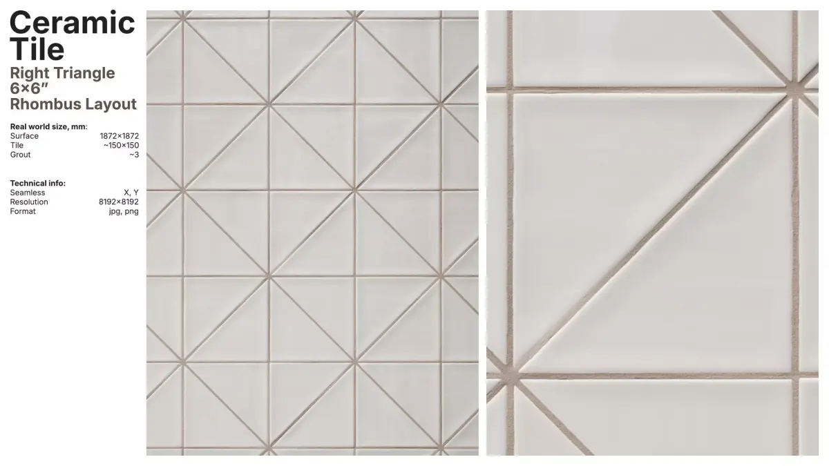 Glazed artisan ceramic tile material in a right triangle 6x6" format arranged in a rhombus layout.